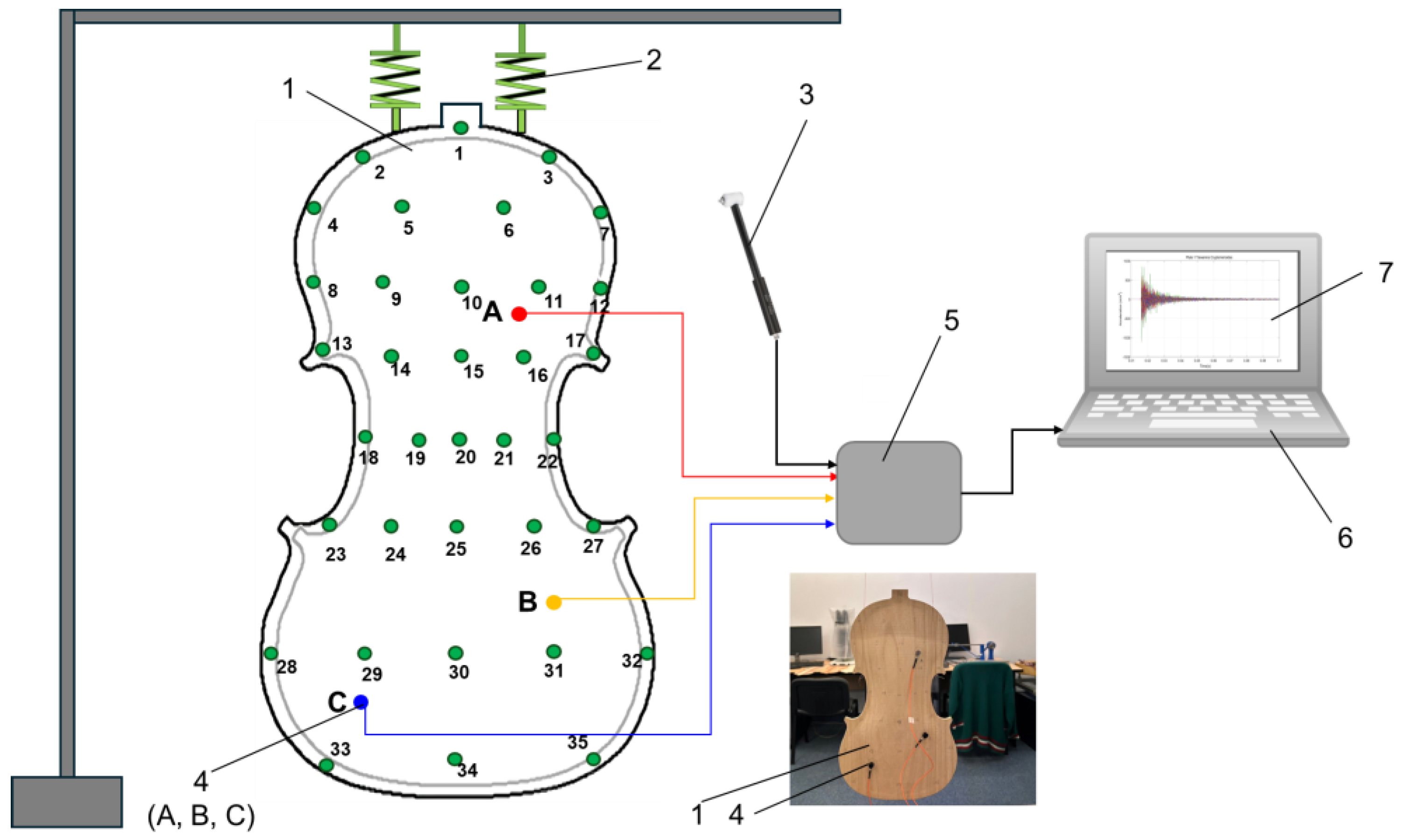 Figure 3. Experimental setup for EMA. (Legend: 1—the violin plate; 2—elastic supports; 3—impact hammer applied in marked points (1—35); 4—accelerometers (A, B, C); 5—Dynamic Signal Acquisition System; 6—computer; 7—processing data program; The red, yellow, blue arrows represent the connections from the accelerometers to the acquisition board).