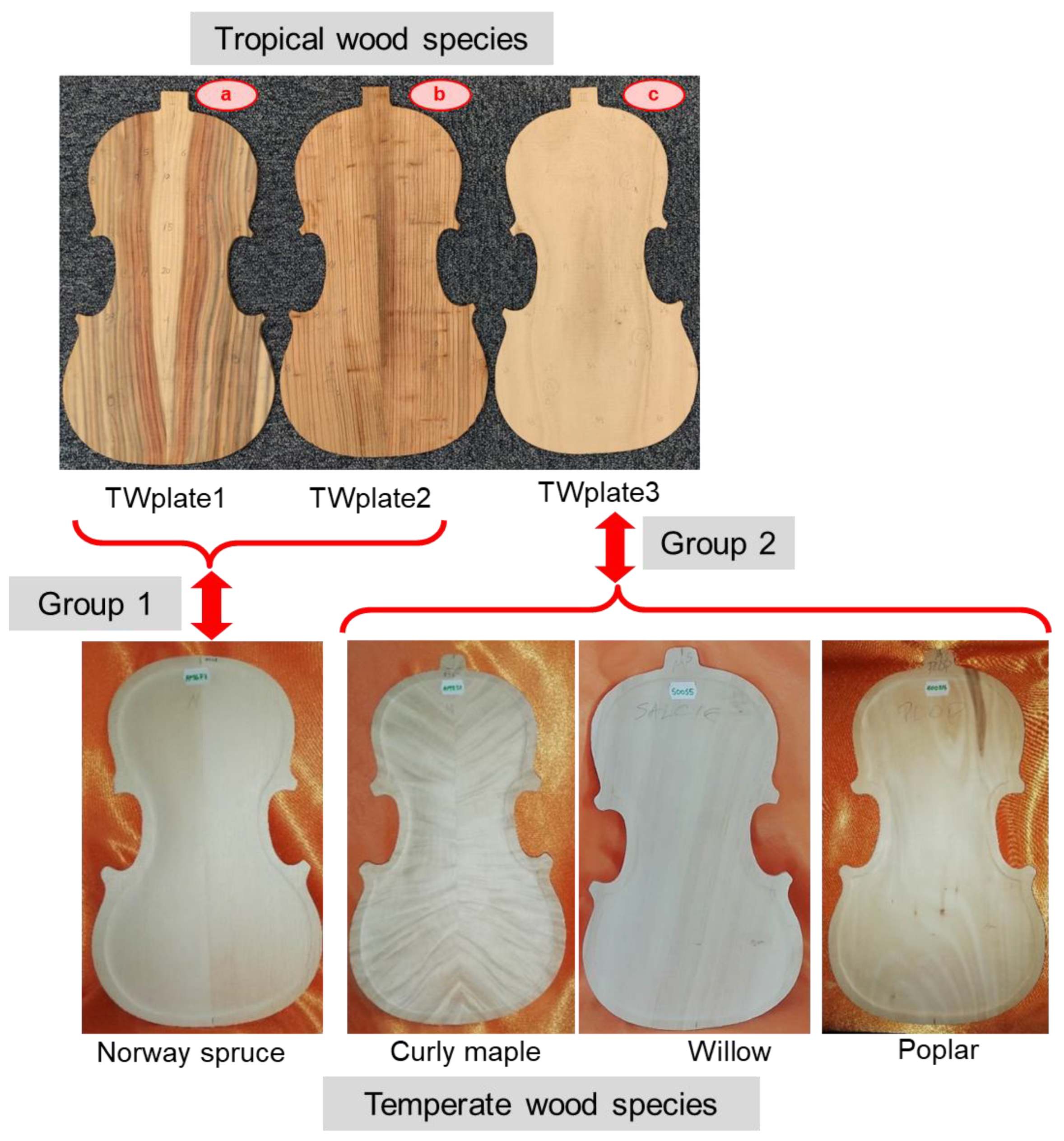 In the present study, three tropical wood species from Taiwan, such as Taiwania cryptomerioides Hayata (Taiwania), Cryptomeria japonica (Japanese cedar), and Firmiana simplex (Chinese umbrella), and four temperate wood species from Romania (Picea abies (Norway spruce), Acer pseudoplatanus (maple), Populus nigra (poplar), Salix alba (willow), and Firmiana simplex (Chinese parasol known as Phoenix tree)) were analyzed. The spruce wood samples were obtained from wood logs harvested from the Moldovița Forest District (Suceava-Bucovina), Romania, known for its stands of resonant Norway spruce. The maple wood samples with curly fiber come from trees harvested from the Gurghiu Mountains, Romania, and the poplar and willow wood come from the Mures River Plain, Romania [17,18]. The tropical wood—Taiwania cryptomerioides Hayata (Taiwania), Cryptomeria japonica (Japanese cedar), and Firmiana simplex (Chinese umbrella)—comes from Taiwan. The Taiwania and Japanese cedar wood comes from trees felled by typhoons, their harvesting being quite difficult due to the high altitudes [19,20,21,22]. Also, identifying the use of wood from trees felled by typhoons to produce different components for violins and guitars is an objective of sustainable wood utilization [23,24,25]. The two Taiwanese wood species used in this study—Taiwania, or Taiwan cedar, and Chinese parasol—were obtained from thinning wood approximately 40 years old and 20 years old, respectively. Their density and annual ring spacing differ significantly from traditional spruce and maple, which may be a major factor influencing their acoustic properties. The plates were grouped into two categories: group 1 containing the coniferous samples—spruce, Japanese cedar, and Taiwania—and group 2 containing the deciduous species—maple, poplar, willow, and Chinese parasol. Figure 1 shows the types of samples tested, and Table 1 presents the physical characteristics of the samples. The experimental violin plates were prepared following the standard templates used for traditional spruce and maple violin plates. Therefore, the results from this study can provide valuable reference data for future processing or adaptation of these alternative wood species, offering more informed guidance to instrument makers.