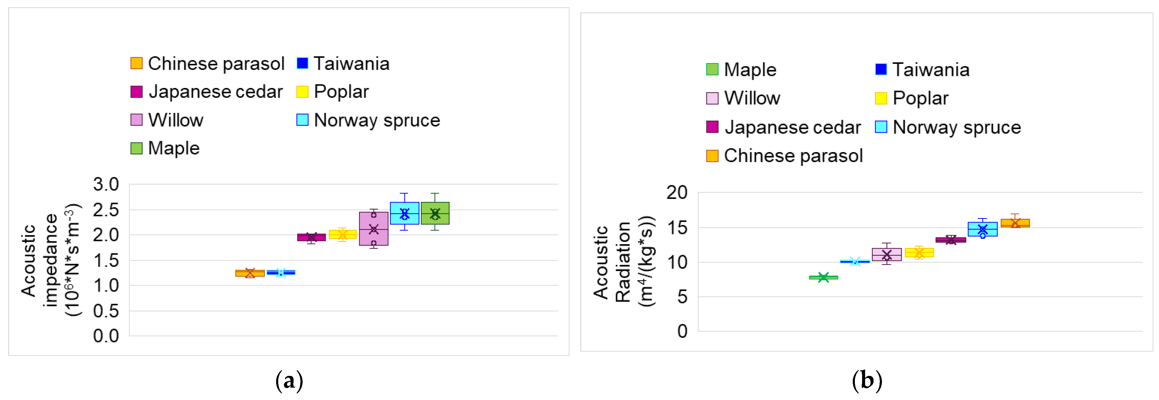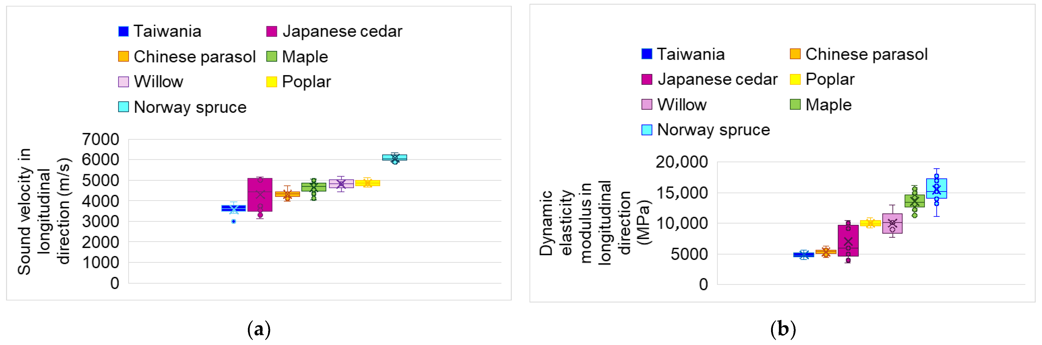 An important characteristic of wood for musical instruments is the speed of sound propagation, a property that has been studied by numerous researchers [31,32,33,34]. Thus, in Figure 5a, one can observe the stratification of the species studied according to the speed of sound propagation, highlighting the distribution of data through quartiles, showing the minimum, first quartile, median, third quartile, and maximum values. It can be noticed that there is a normal distribution of values for Taiwania and maple samples, a positive skew for Japanese cedar, poplar, and spruce, respectively, and a negative skew for Chinese parasol and willow.