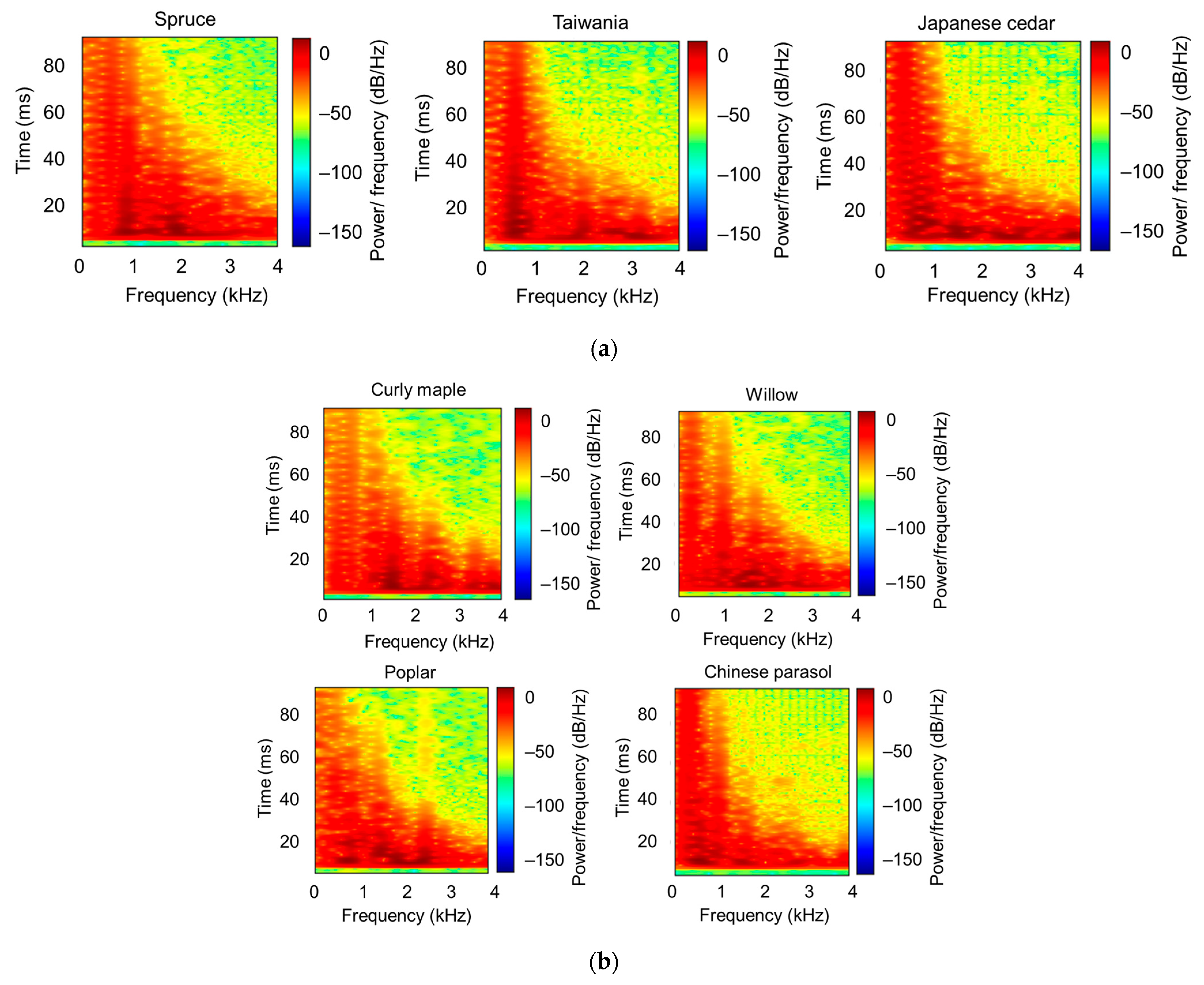 Figure 7. Spectrograms of signals: (a) violin plates from group 1; (b) violin plates from group 2.