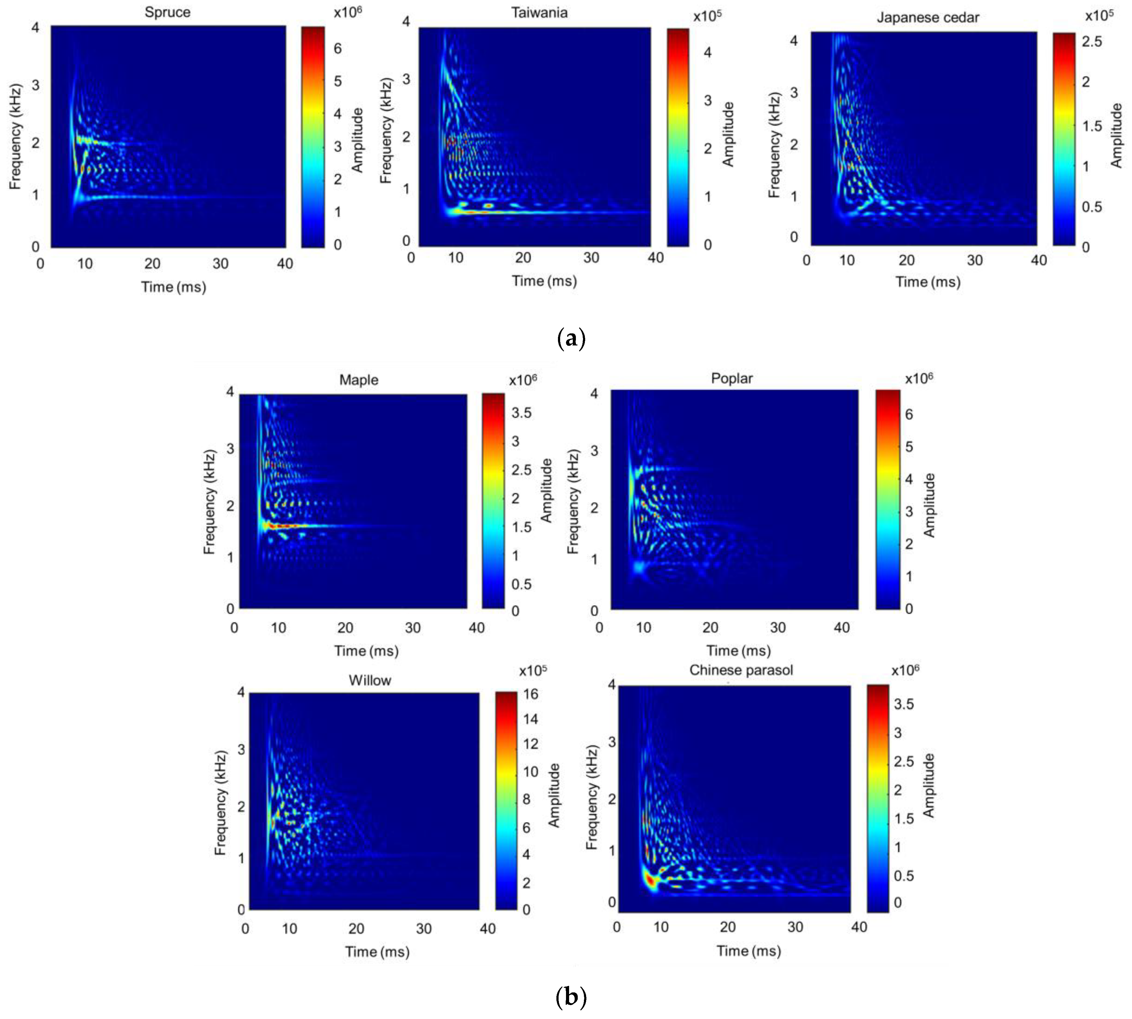 Figure 8. Wigner–Ville distribution of signals: (a) violin plates from group 1; (b) violin plates from group 2.