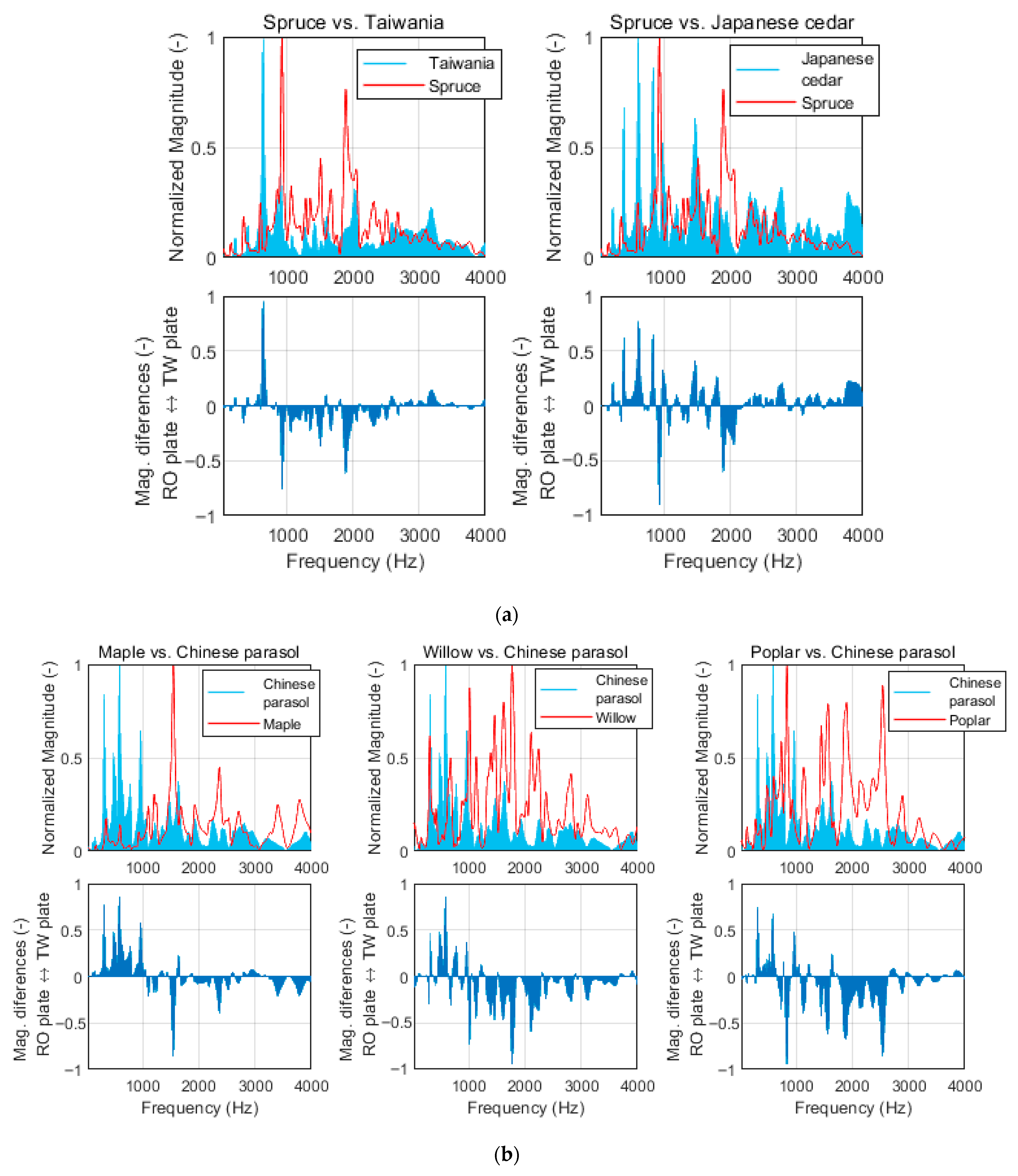 In the comparisons of the frequency spectra, the Norway spruce plate was considered as a reference for group 1 because this is the wood species established for violin top plates (Figure 9a), and the Chinese parasol wood plates were considered as a reference for the second group (Figure 9b). Within the analysis of each group, overlapping spectra (in the upper part of each figure) and spectral differences (in the lower part) can be distinguished. Regarding the first group of boards analyzed (spruce versus Taiwania and Japanese cedar), it can be stated that the comparative analysis of the frequency spectra clearly highlights the following aspects: the Taiwania plate presents a dominant frequency around 600 Hz, otherwise having an amplitude spectrum rich in harmonics (extending up to 3500 Hz), but with reduced weights in the spectral ensemble; the Japanese cedar plate offers a much richer spectrum, with representative harmonics up to 4000 Hz, with dominant harmonics below 1000 Hz and a representative peak around 1500 Hz. With all these apparently different characteristics, the spectral difference diagram clearly indicates that the tropical wooden plates offer a relevant spectrum in a range lower than the 800 Hz value, while the spruce board presents two dominant spectral components near the values of 900 Hz and 1800 Hz (Figure 9a). The second group of plates shows that plates from temperate wood species have representative spectral components in the range above 1000 Hz, while tropical wood plates do not exceed 950 Hz. The frequency spectrum of these boards are much richer in harmonics, but the comparative representativeness is clearly in favor of those from temperate wood for the medium-high frequency range and of tropical wood for the low frequencies (Figure 9b). Table 2 presents the values of the resonance frequencies extracted from the FFT analysis, and the dominant frequencies are highlighted in bold.