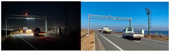 To verify the test scenarios, a testbed was constructed on the Saemangeum Seawall in Gunsan, where vehicle traffic could be controlled and high-speed driving tests could be conducted, as shown in Figure 4 The overloading detection system installed on the testbed consists of three main components: the WIM system, the AVI (Automatic Vehicle Identification) system, and the VPS (Visual Positioning System). The WIM system is embedded in the road surface and is responsible for measuring the total weight and axle load of passing cargo vehicles. The AVI system uses high-resolution cameras to capture images of all passing vehicles and recognizes their license plates. The VPS measures the dimensions (height, width, length) of the cargo trucks, including the shape and size of the load. The information measured by the installed systems is summarized in Table 13.