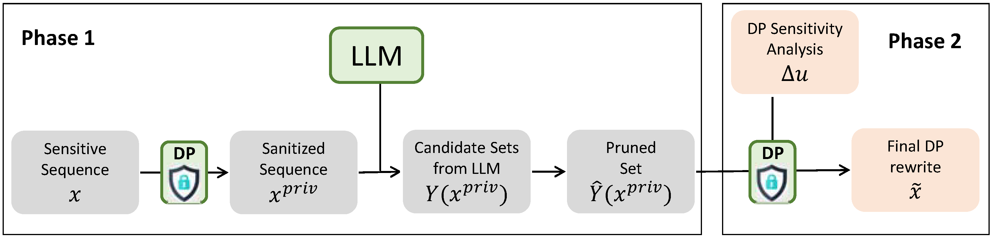 - Phase 2 (Differentially private selection): From the candidate set, we choose a single rewrite using the exponential mechanism. This mechanism samples according to a bounded similarity score with respect to the input, so that the final output preserves meaning while incorporating randomized noise for privacy.