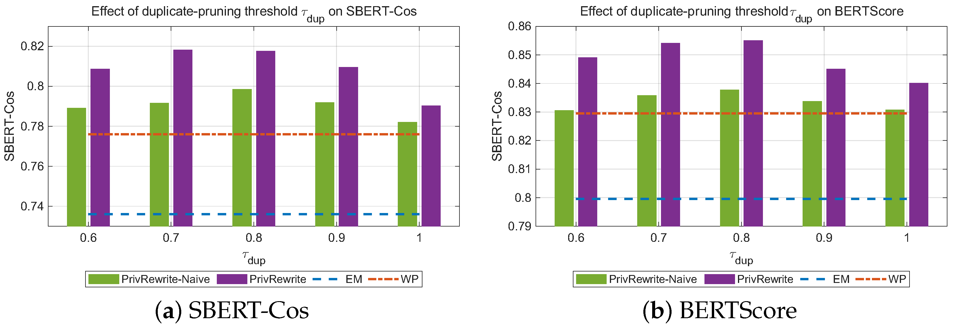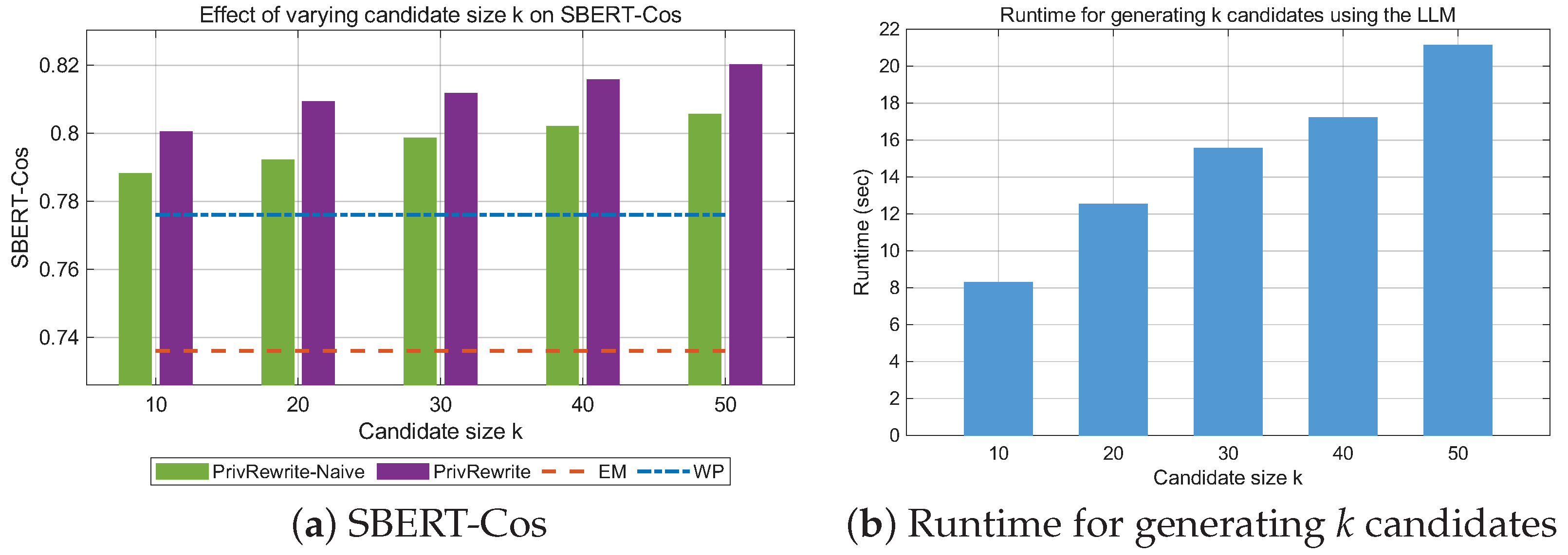 - PrivRewrite with naive sensitivity (PrivRewrite-Naive): A variant of our method where the global sensitivity in Phase 2 is conservatively set to . This baseline isolates the effect of our proposed tight sensitivity analysis.
