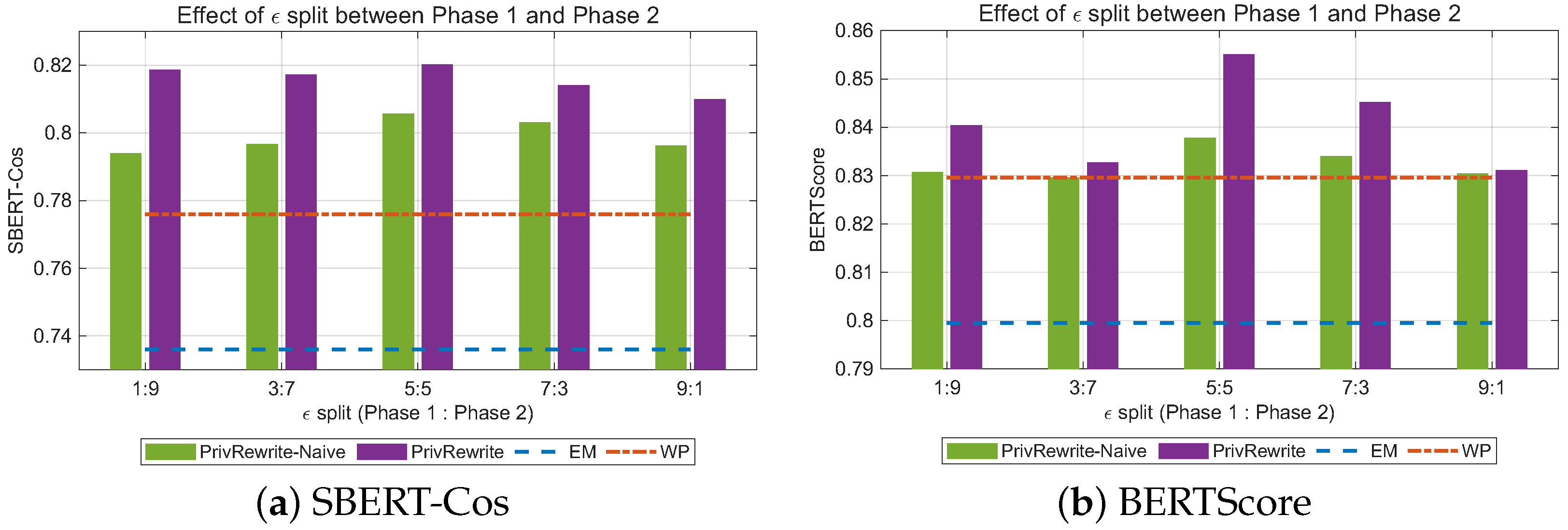 - Exponential mechanism-based text rewriting (EM): An approach that applies the exponential mechanism [39] to rewrite each token independently. This corresponds to directly releasing the token-level sanitized text produced in Phase 1.
