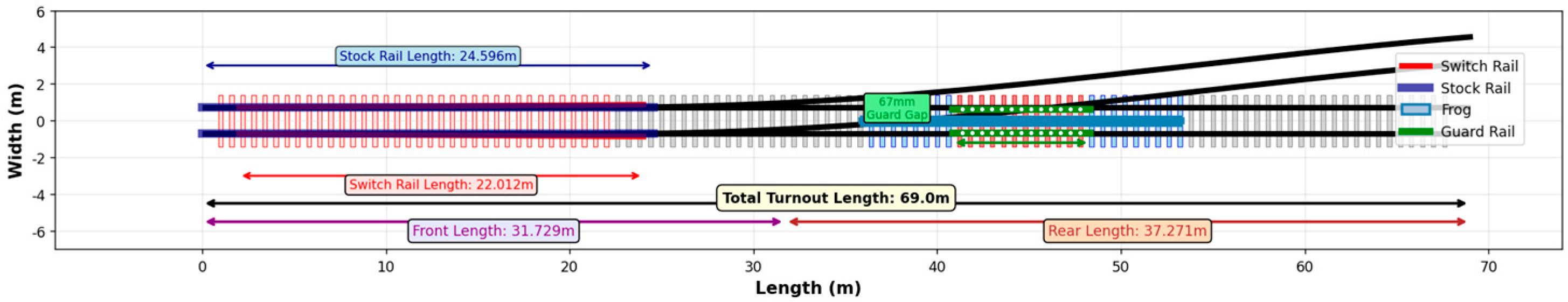 - Xiao, Q.; Yang, Y.; Chang, C.; Li, D. Monitoring and Evaluation of High-Speed Railway Turnout Grinding Effect Based on Field Test and Simulation. Appl. Sci. 2023, 13, 9177. [Google Scholar] [CrossRef]