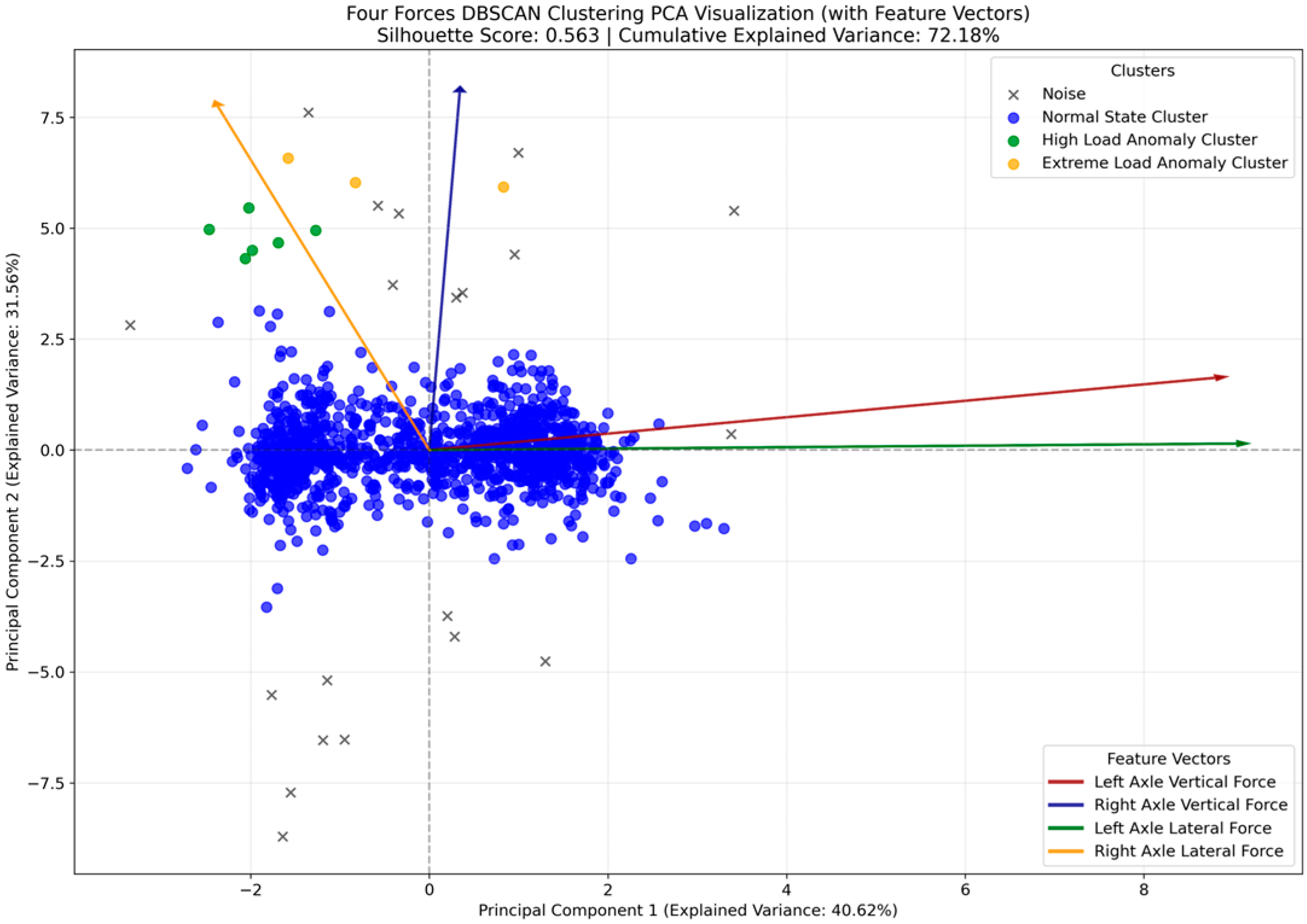- The PCA and feature vectors in this study well explain the influence of factors. However, they only include vertical and lateral forces, without incorporating spectral characteristics, L/V indicators, and other information into the comprehensive analysis. This to some extent limits the capability of multidimensional feature representation in state identification and may also affect the comprehensive characterization of turnout performance under complex operating conditions.