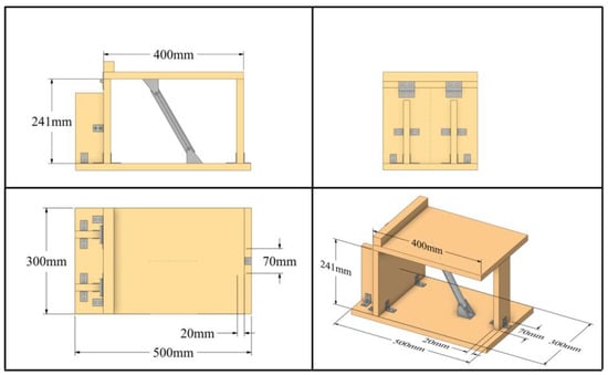 To fulfil these specifications, the structure was constructed from 20 mm thick wooden panels joined with metallic L-shaped brackets and screws, providing rigidity and dimensional stability. A movable ramp was mounted on this frame, with a stopper placed at its lower edge to prevent excessive displacement or detachment of particles during the tests (Figure 4).