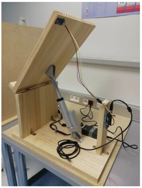 The measurement system was based on an Arduino UNO microcontroller (Via Andrea Appiani 25, 20900 Monza (MB), Italy) programmed to process sensor data and transfer it to a PC. For angle detection, a GROVE IMU 9DOF V2.0 sensor (Seeed Studio. 9F, Building G3, TCL International E City, ZhongShanyuan Road, Nanshan District, Shenzhen 518000, Guangdong Province, China) (integrating a three-axis accelerometer, gyroscope, and magnetometer) was connected to the Arduino through an I2C interface (GND, 5 V, SCL, SDA). The Arduino board was powered and linked to the PC via USB connection, while the actuator received energy from a dedicated 12 V DC power supply controlled through the potentiometer. Jumper wires were used to establish stable connections between the microcontroller and the IMU.