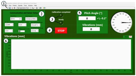 Control panel. (1) Run-button, (2) communication and sensor setup, (3) “calibration completed” and “ready” lights, (4) stop button, (5) pitch angle and vibrations indicators and (6) waveform graph.