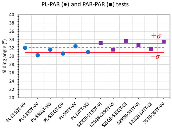 To assess if the type of contact influences the sliding angle, a Student’s t-test for two samples was carried out grouping tests 1–6 (plate–particles, PL–PAR) and tests 7–12 (particles–particles, PAR–PAR). On average, the sliding angle was slightly higher for particle–particle contacts, with a mean difference of 1.41°, the t-statistic (t) from Student’s t-test was −2.88, with a corresponding p-value (p) of 0.016. This difference was statistically significant, which suggests that the type of contact could have an effect.