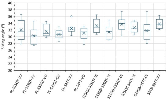 Overall, the mean sliding angles ranged from 30.2° (Test 4, PL-S3SQT-OV) to 34.4° (Test 12, S5TB-S6TT-VV). Standard deviations were generally low, between 0.8° and 2.9°, indicating a high repeatability of the measurements. The minimum and maximum values within each group also showed limited scatter, with ranges typically below 10°.