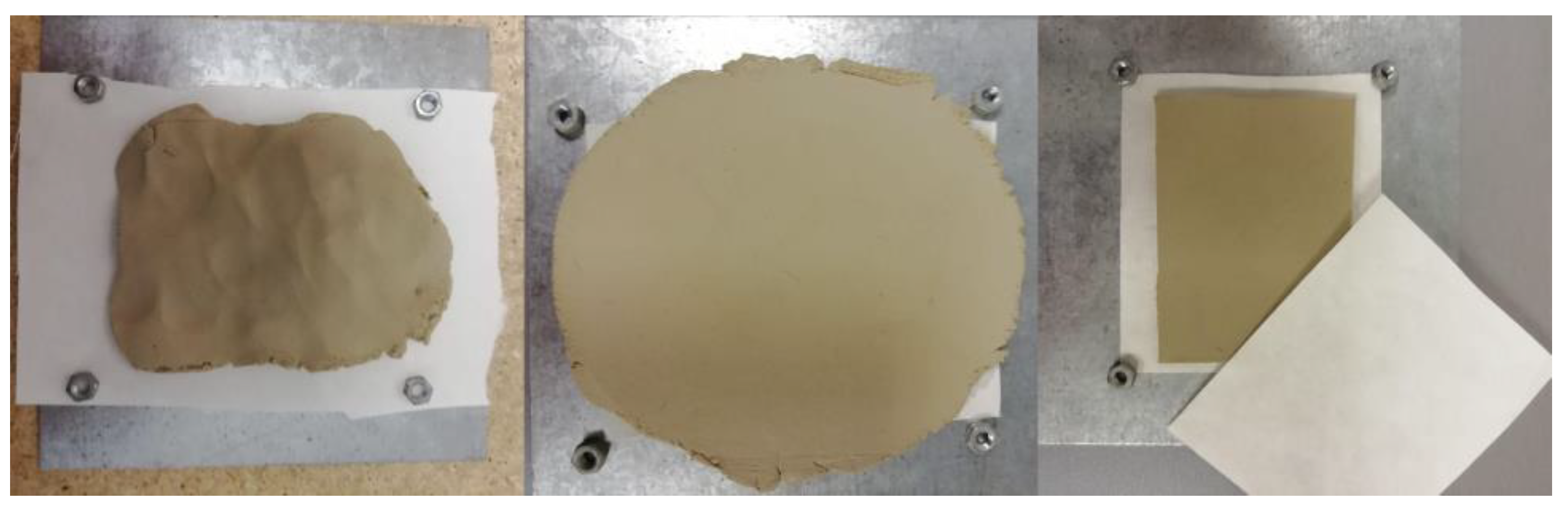 Plates were produced by placing clay between two metal sheets to ensure flatness and two paper sheets to prevent sticking. Four bolts served as a top to maintain uniform thickness during pressing. Each clay plate was cut into a rectangular shape (7 cm × 5 cm) and re-pressed to ensure homogeneity. After removal from the press, the clay plates were kept between metal plates during a 72 h drying period to minimise imperfections (Figure 2).