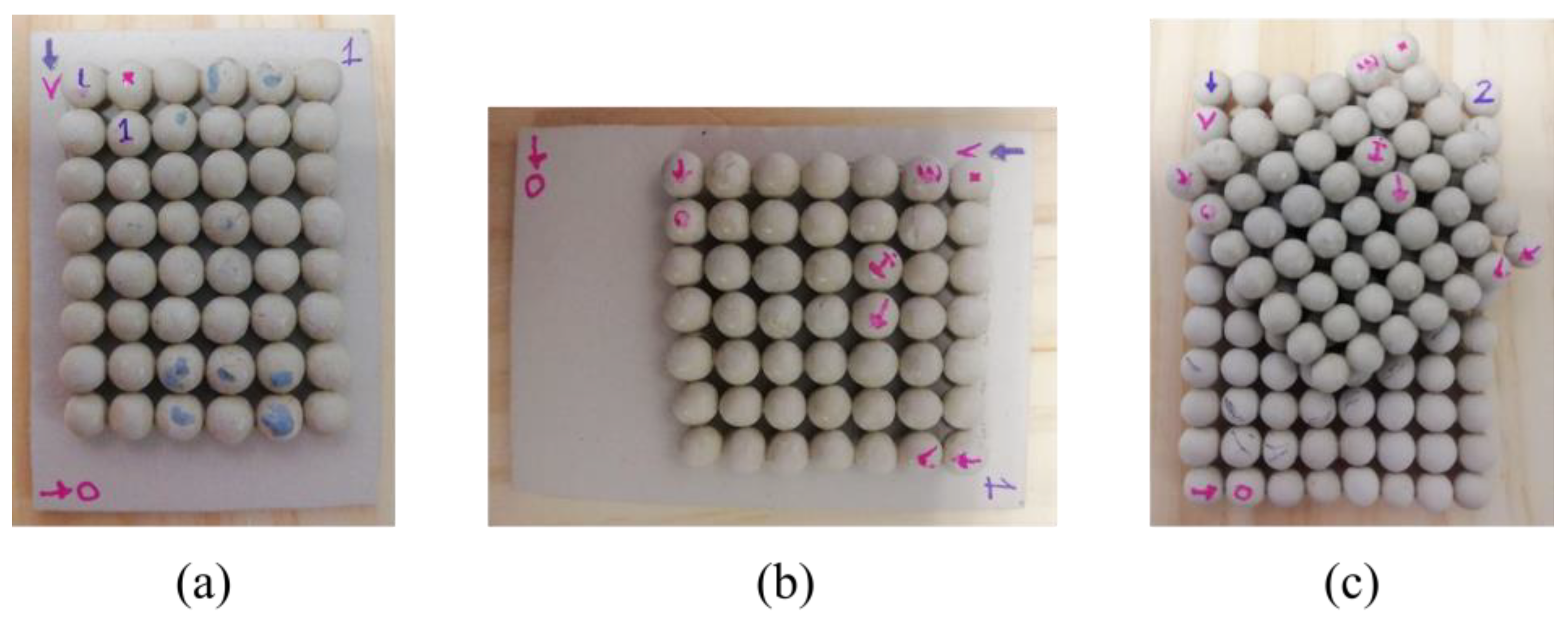 For example, in Figure 3a, PL-S1SQT-VV means that PL is at the bottom, S1SQT is on top, which is the first sample produced with the centres of the spherical particles arranged according to a square, and both are oriented with their longer sides in the direction of the displacement (VV). Figure 3b,c show other examples. One flat plate (PL) and seven plates of spherical particles of clay (S1SQT, S2SQB, S3SQT, S4TT, S5TT, S6TB, S7TT) were produced—see Table 1.