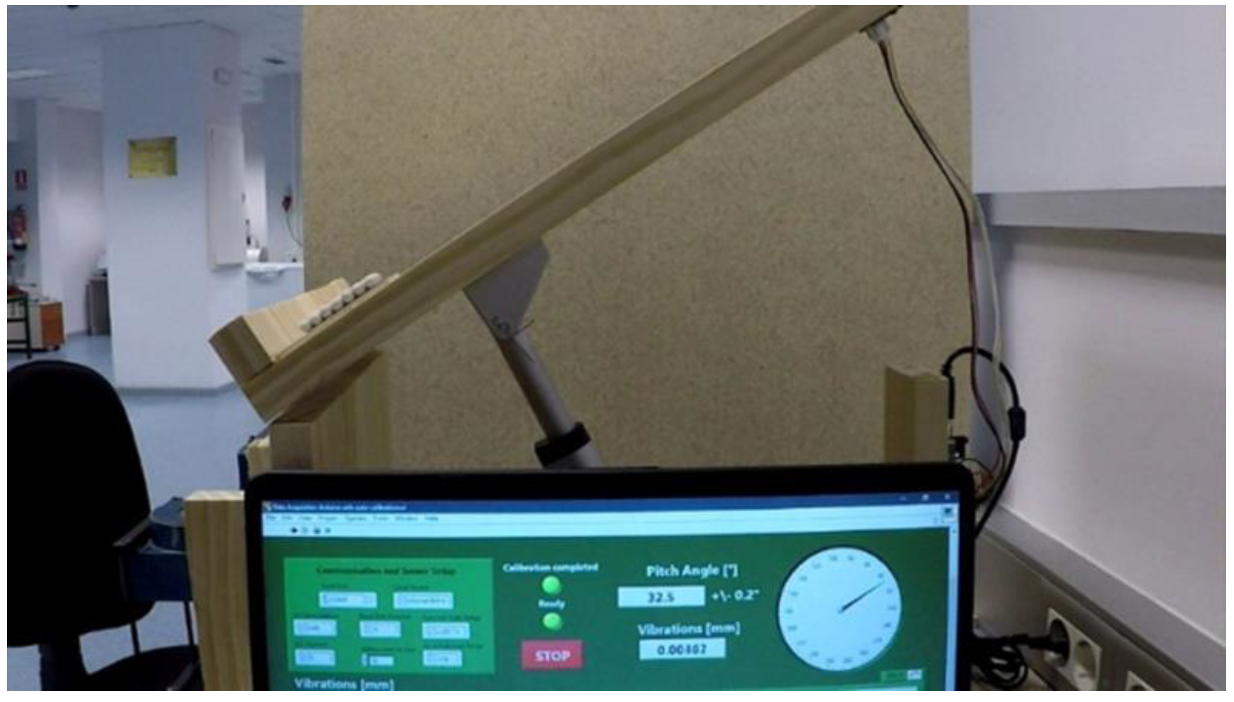 Communication between the Arduino and the PC was managed through LabVIEW 2017 software (National Instruments Corporation, 11500 North Mopac Expressway, Building B, Austin, TX 78759-3504, USA), which also provided a graphical user interface for real-time monitoring and data logging. The LabVIEW program incorporated automatic calibration routines and displayed angular position, vibration signals, and sensor status indicators. This configuration allowed continuous tracking of the ramp inclination and immediate identification of the onset of particle sliding, reducing the risk of human error.