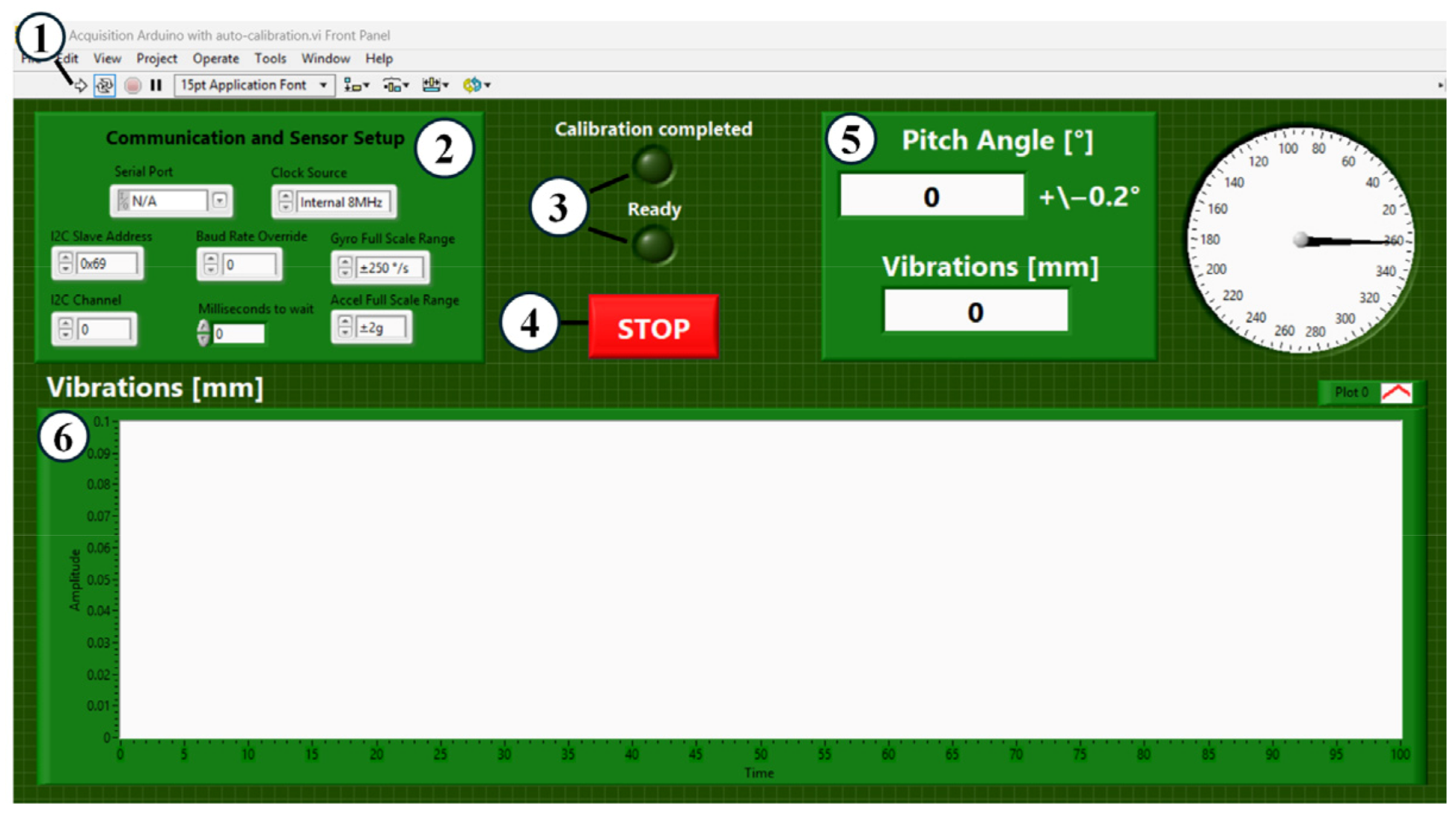 Figure 10. Control panel. (1) Run-button, (2) communication and sensor setup, (3) “calibration completed” and “ready” lights, (4) stop button, (5) pitch angle and vibrations indicators and (6) waveform graph.