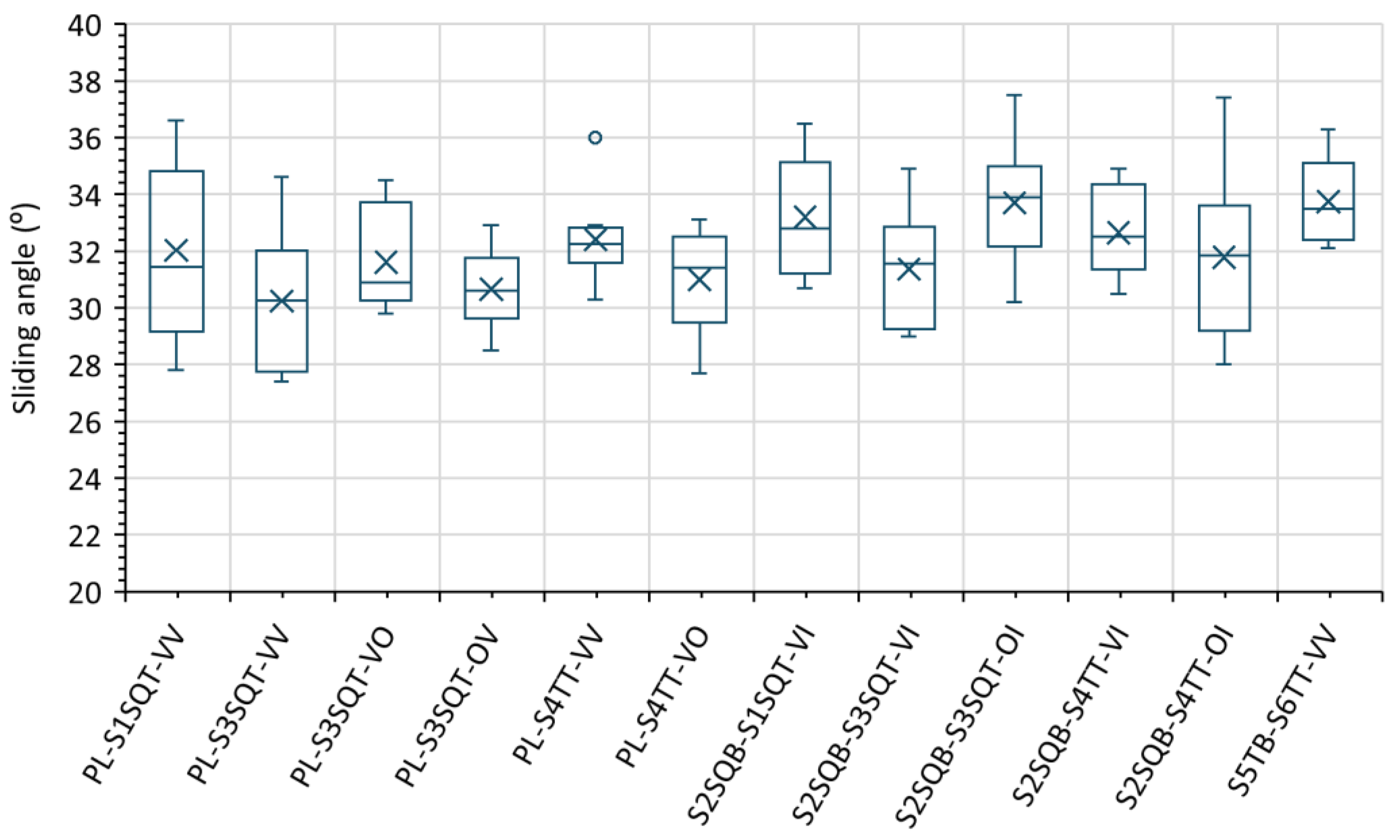 Overall, the mean sliding angles ranged from 30.2° (Test 4, PL-S3SQT-OV) to 34.4° (Test 12, S5TB-S6TT-VV). Standard deviations were generally low, between 0.8° and 2.9°, indicating a high repeatability of the measurements. The minimum and maximum values within each group also showed limited scatter, with ranges typically below 10°.