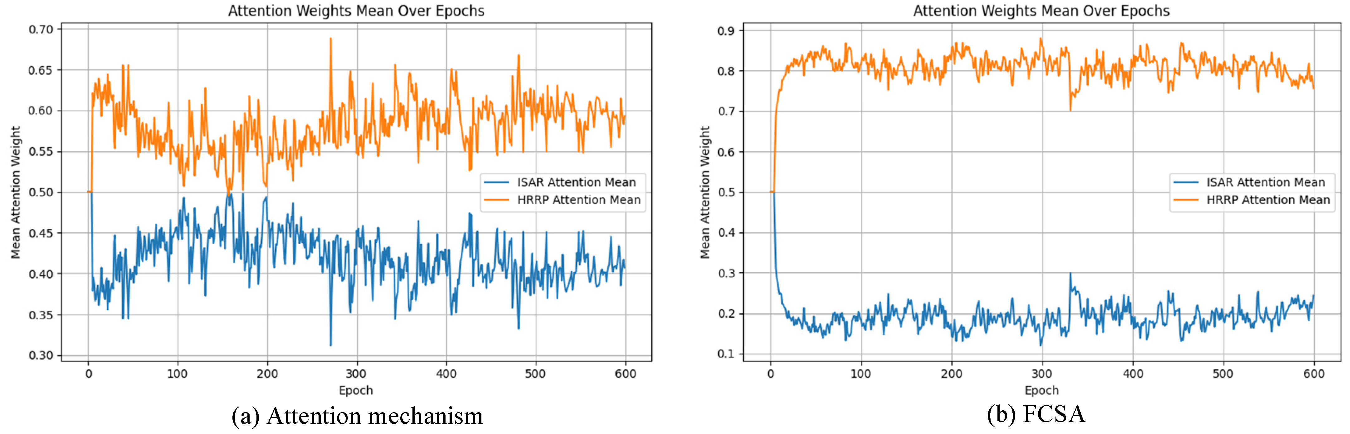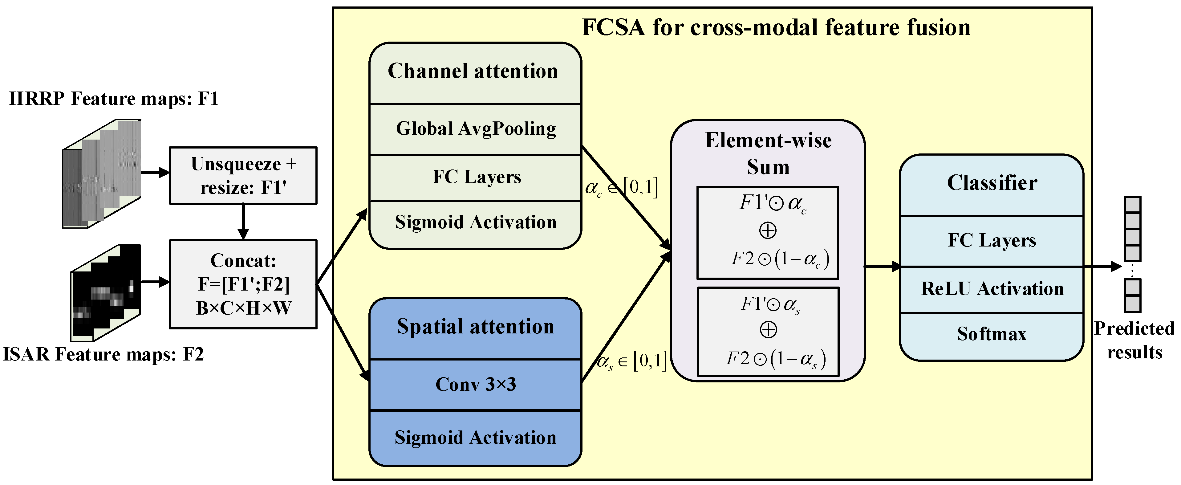 - A novel FCSA mechanism is designed in our model to dynamically integrate cross-modal features of HRRPs and ISAR images by fine-grained spatial–channel interdependency, which enables learning more comprehensive feature representations by leveraging complementary information from the heterogeneous radar modalities.