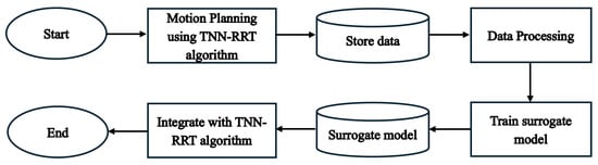 The use of genetic algorithms combined with simulation environments like Robot Operating System (ROS) and Open Motion Planning Library (OMPL) facilitates practical implementation and near-optimal solutions within reasonable computation times [,]. Surrogate models and adaptive algorithms reduce computational burdens by approximating expensive evaluations, enabling faster convergence in complex motion planning problems [,]. Conventional surrogate-assisted methods can be broadly divided into three categories. (i) Offline-trained global surrogates, where a model is pre-trained on extensive simulation or experimental data to approximate collision costs or dynamic feasibility []. These approaches achieve fast evaluations but often struggle when applied to unseen regions of the configuration space. (ii) Online-updated local surrogates, which incrementally refine the surrogate during planning [,]. These methods adapt better to new environments but incur additional computational overhead for model updating. (iii) Hybrid approaches, where surrogates are used selectively, for example, as a first filter before exact collision checking [,]. Such methods balance speed and accuracy but may introduce approximation errors that affect safety-critical tasks.