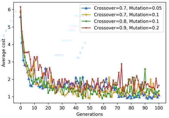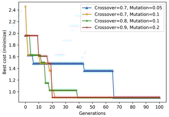 In this subsection, we analyze the performance of GA-based posture optimization for the 6-DOF manipulator. The goal of the optimization is to minimize the composite cost function calculated using Equation (35), which includes collision penalties, cycle time (time to move from initial to optimized configuration), and reach time (cumulative time to reach the pick, place1, and place2 configurations from the optimized posture). The GA was executed with a population size of 30 over 100 generations, and the best solution was selected based on the lowest fitness value.