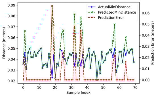 Actual versus predicted minimum distances with corresponding prediction errors for the Extra Tree regressor surrogate model.