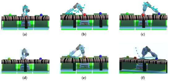 Figure 10 provides a comparative visual analysis of the representative paths generated by the TNN-RRT in Figure 10a–c and SA-RRT in Figure 10d–f algorithms for the pick, first placement, and second placement tasks, respectively. Although neither TNN-RRT nor SA-RRT provides theoretically guaranteed global optimality for the obtained trajectories, the SA-RRT variant used in this work offers an improved trajectory quality compared to TNN-RRT. In SA-RRT, when a surrogate match exists for a robot-target position pair, it directly retrieves joint configurations that the surrogate predicts to be near-optimal (minimal end-effector distance) and expands the tree from those near-optimal states first while still preserving random exploration when no match is found. This bias systematically reduces the expected number of expansions required to reach the target and therefore converges toward shorter and smoother feasible trajectories in fewer iterations compared to the baseline TNN-RRT. The TNN-RRT trajectories exhibit longer deviations and more irregular motion patterns as shown in Figure 10a–c, whereas the SA-RRT trajectories demonstrate smoother joint transitions with reduced path deviations as shown in Figure 10d–f, respectively. This qualitative difference aligns with the quantitative performance improvements reported in Table 4 and reinforces that SA-RRT consistently generates more efficient motion paths.