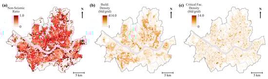 Spatial distribution of structural indicators: (a) non-seismic building ratio, (b,c) building and critical facility density.