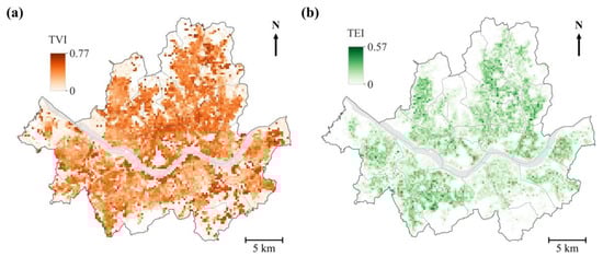 Spatial distribution of Level 2 indices: (a) TVI and (b) TEI.