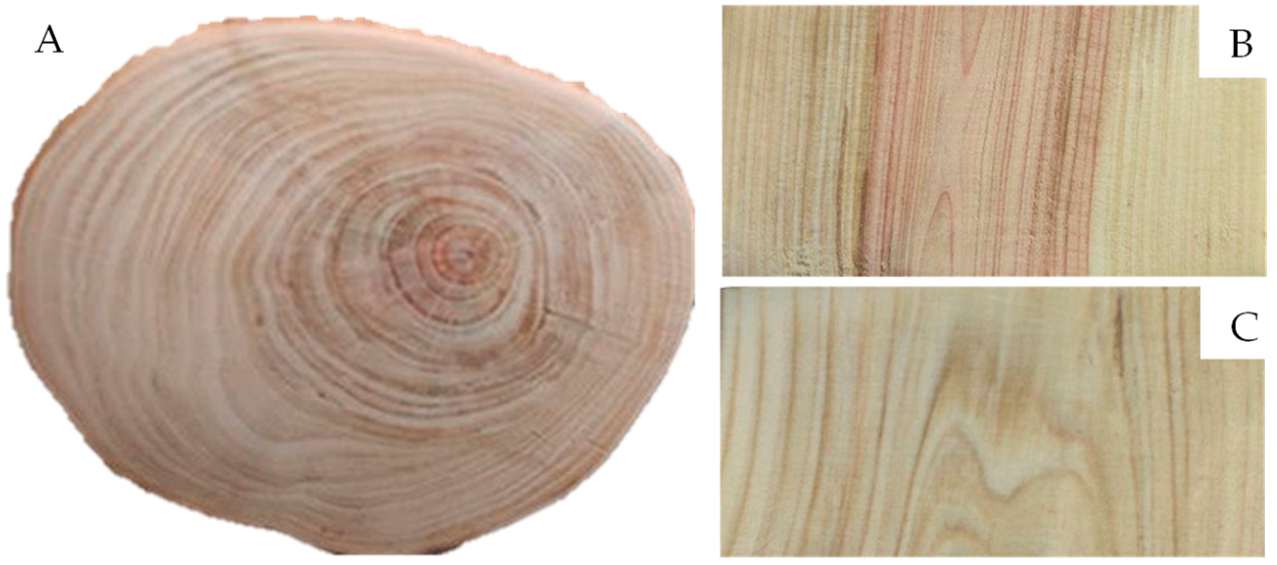Figure 1A. In the cross section, many growth wheel textures were observed and were particularly obvious; the heartwood and sapwood were distinctly differentiated, with the sapwood being light yellowish-brown and the heartwood being reddish-brown. The wood rays were narrower, not obvious to the naked eye, and were slightly visible under magnification. Early and latewood were also slightly visible under magnification. As shown in