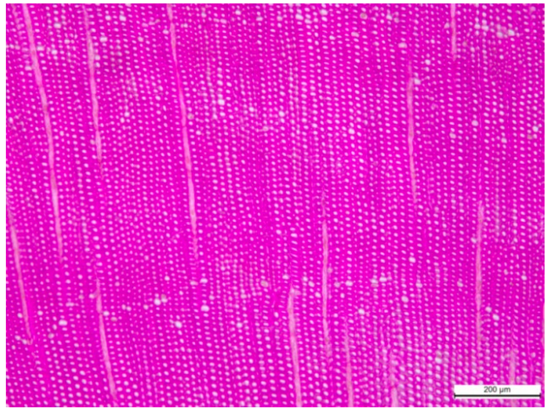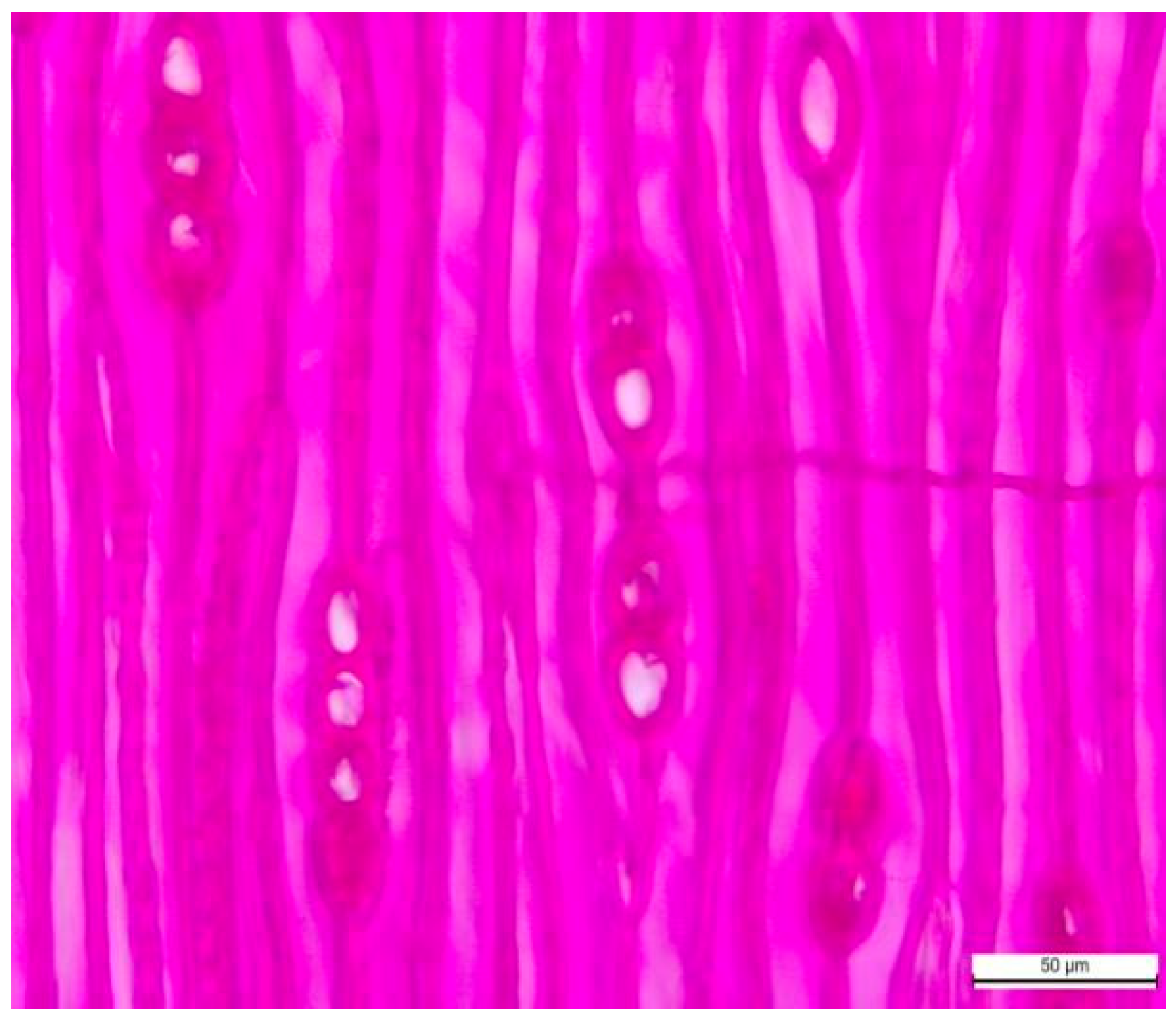 A sectioning experiment was conducted to observe the microscopic characteristics of Lijiang juniper wood. Each Juniper specimen was sawn into a square shape, wrapped in gauze and labeled, and placed in an autoclave for steaming for about 24 h. Sections were made from three different cuts of the wood block and placed on clean slides. A drop of glycerine was applied to the slide, which was then pressed down with a coverslip and further pressed against the coverslip with a lead block. The pressed sections were removed from the slides and immersed in 1% Senna solution for staining for about 8–10 h. The sections were then removed from the staining solution and placed in glassware, after which they were dehydrated step by step by immersing them in 25%, 50%, 95%, and 100% ethanol solution for 5–10 min each, followed by immersion in a mixture of n-butyl alcohol and ethanol solution for 5–10 min. The dehydrated sections were then treated transparently with xylene for about 3 min. Intact transverse, radial, and chordal sections of the dehydrated material were selected, and neutral resin was dropped around the three sections of the slide in order, ensuring there were no air bubbles on the slide, the resin was evenly distributed, and there was no overflow of the coverslip. Finally, the finished permanent slides were placed in a dry and ventilated place to cure [