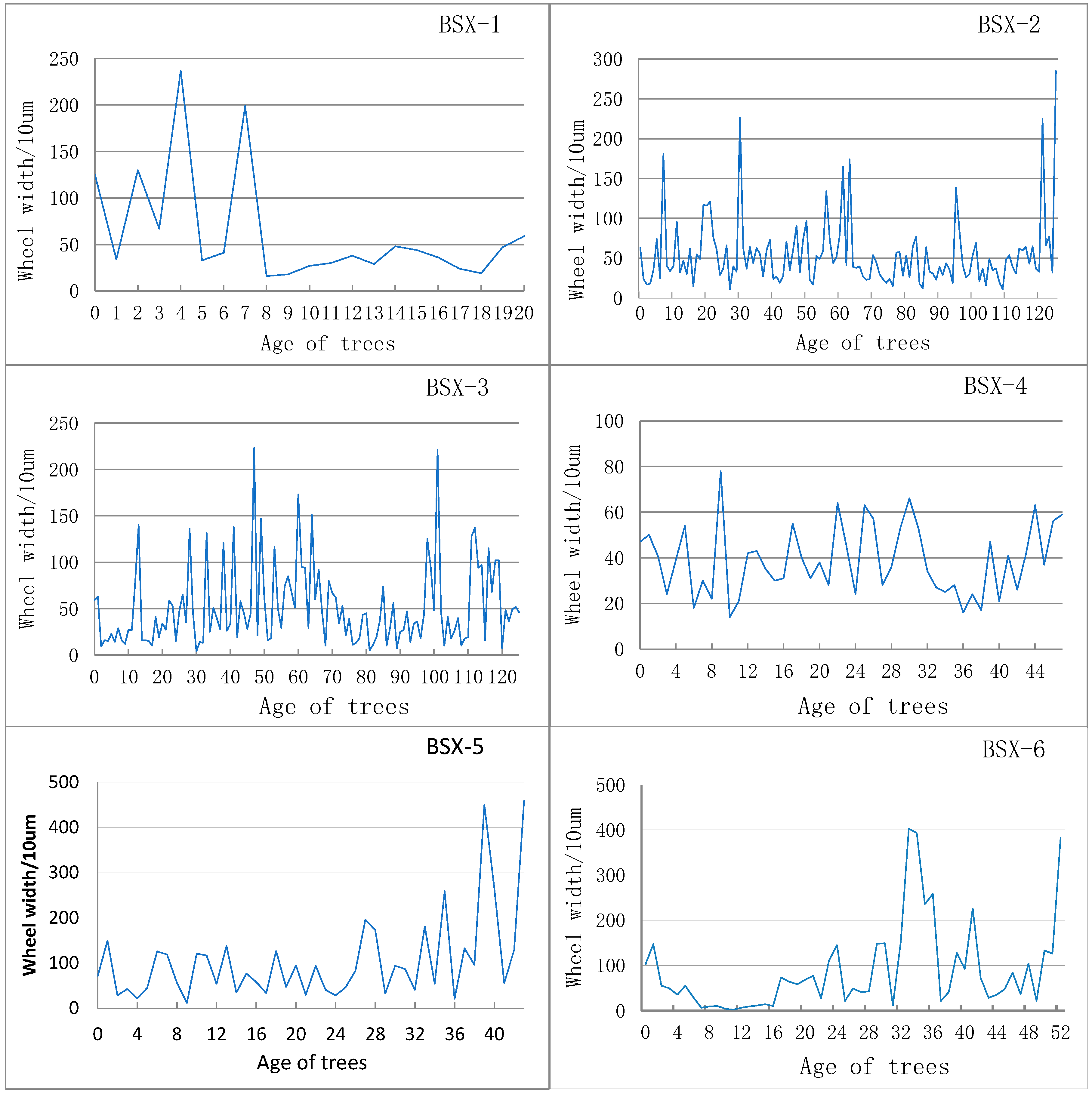 Trend of radial variation of Juniper annual ring width in Baoshan Township, Lijiang City, China (BSX-1 is 20 years old Juniper; BSX-2 is 125 years old Juniper; BSX-3 is 125 years old; BSX-4 is 47 years old; BSX-5 is 43 years old; BSX-6 is 52 years old).