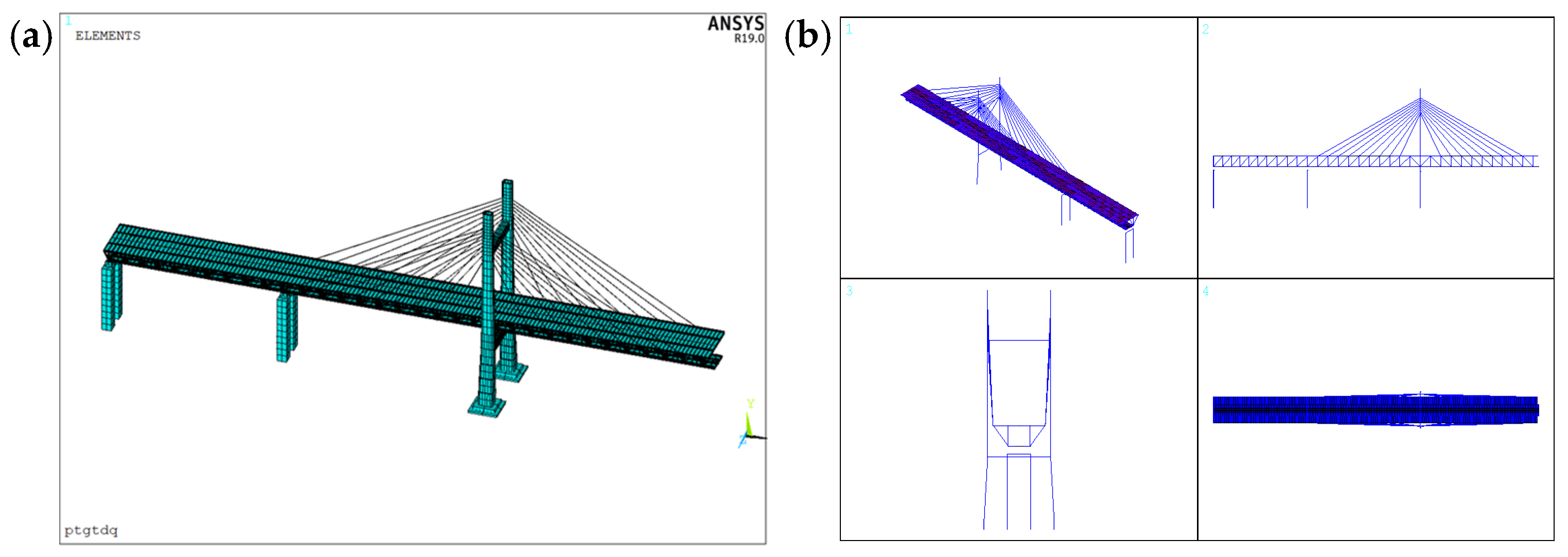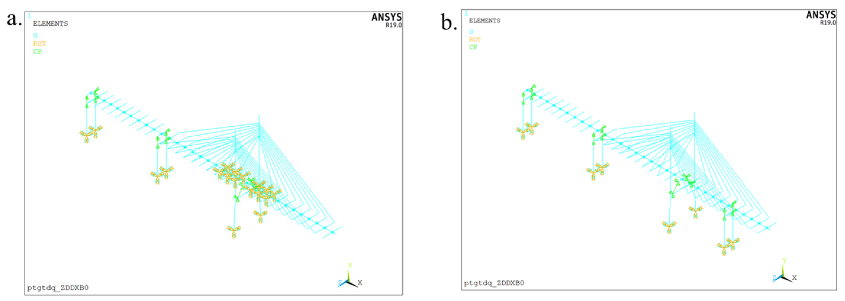 Figure 3. The structural dynamic characteristics under wind load in the maximum single-cantilever state of the main girder were calculated and analyzed, providing a foundation for wind-induced vibration analysis. The main girder is a plate-truss combined structure. Considering the influence of the deck slabs on the force distribution of the main truss, BEAM188 beam elements were used to model the plate–truss combined stiffening-girder members, and SHELL63 shell elements were used to model the concrete and steel deck slabs. The towers were modeled with BEAM188 elements and treated as segmented variable cross-sections; the stay cables were modeled with LINK10 elements, with corrections applied to account for the sag effect on the cables’ effective elastic modulus; rigid trans-verse beams were modeled with BEAM4 elements to connect the main truss to the upper and lower deck systems. Considering factors such as bolted and welded Gusset plates, which would increase the weight of the main girder, the density of the main girder steel material has been increased by 15%, resulting in a density of 9027.5 kg/m