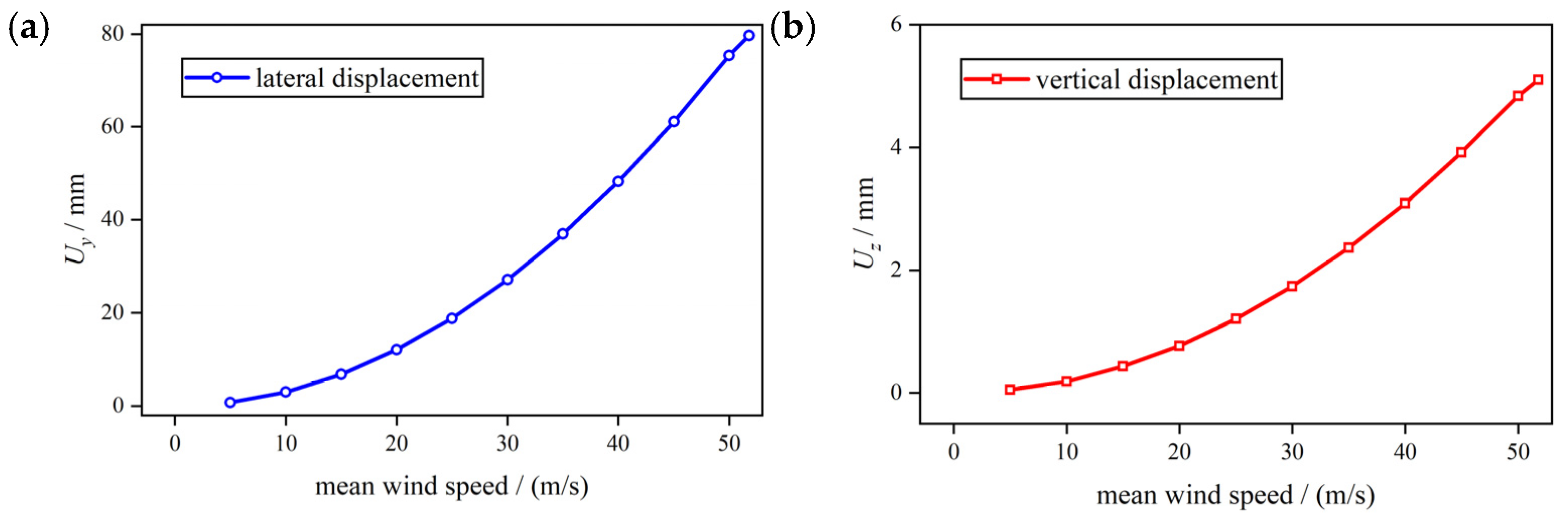 During the construction of railway steel truss cable-stayed bridges, particular attention is paid to the influence of displacements at the cantilever end of the main girder. The static wind displacements of the main span at the cantilever end under wind speeds ranging from 5.0 to 51.4 m/s are depicted in