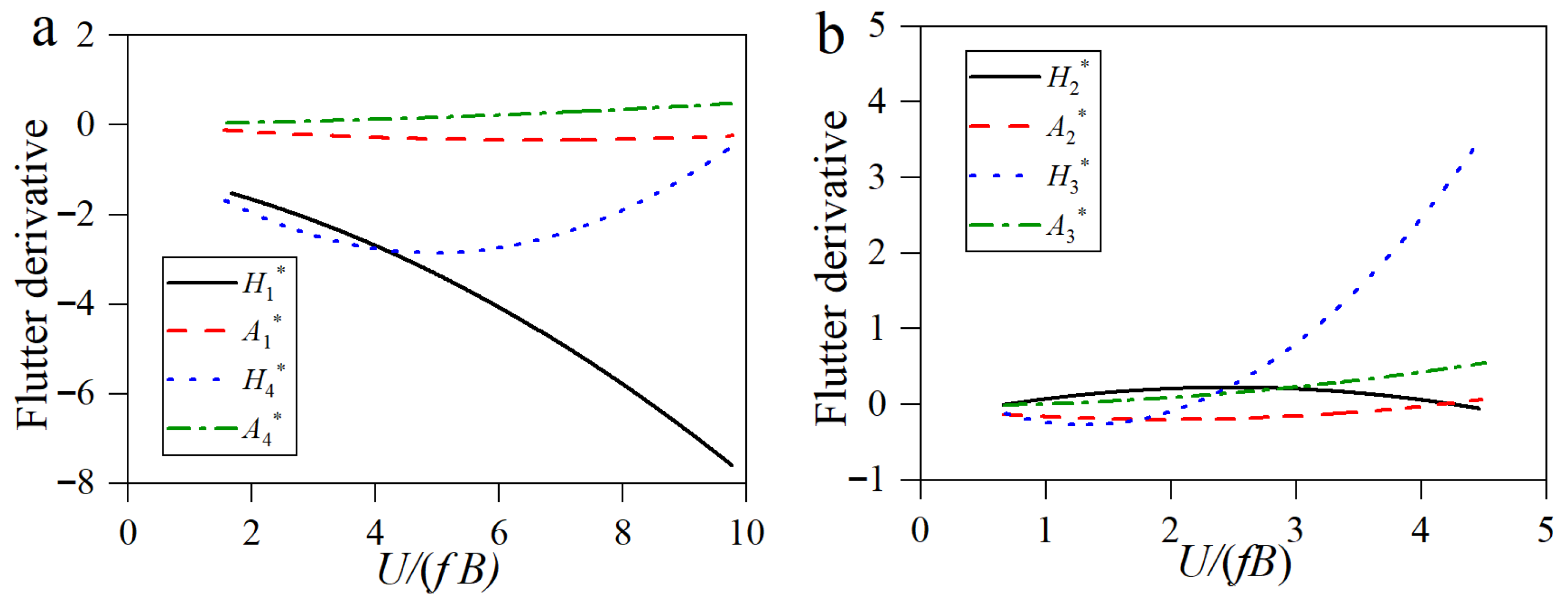 Ai* (i = 1, 2, 3, 4) are the flutter derivatives of the bridge section, all of which are functions of the reduced frequency