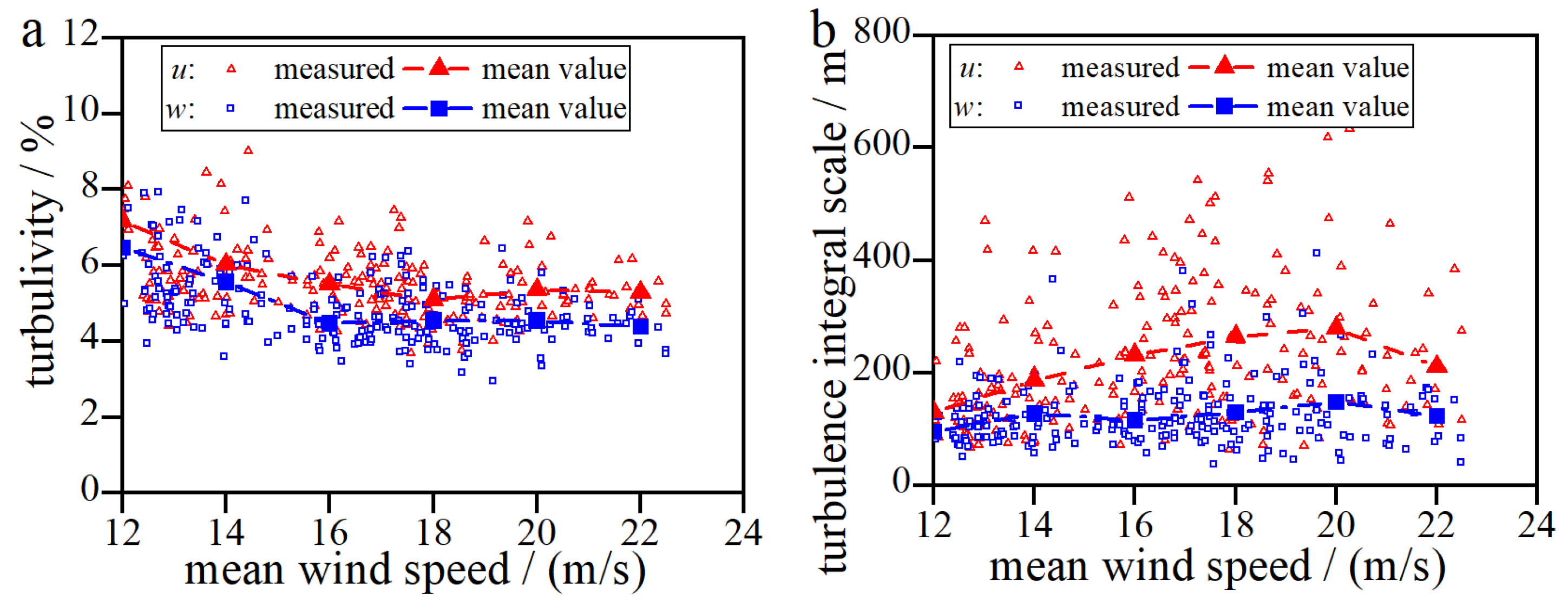 - Li, L.; Kareem, A.; Xiao, Y.; Song, Y.; Zhou, C. A comparative study of field measurements of the turbulence characteristics of typhoon and hurricane winds. J. Wind Eng. Ind. Aerodyn. 2015, 140, 49–66. [Google Scholar] [CrossRef]