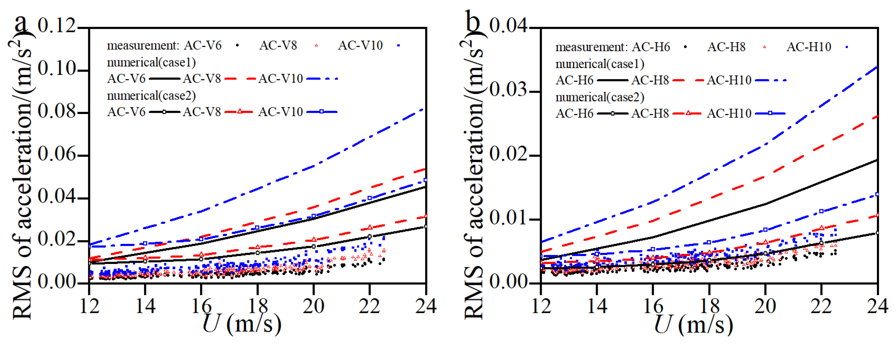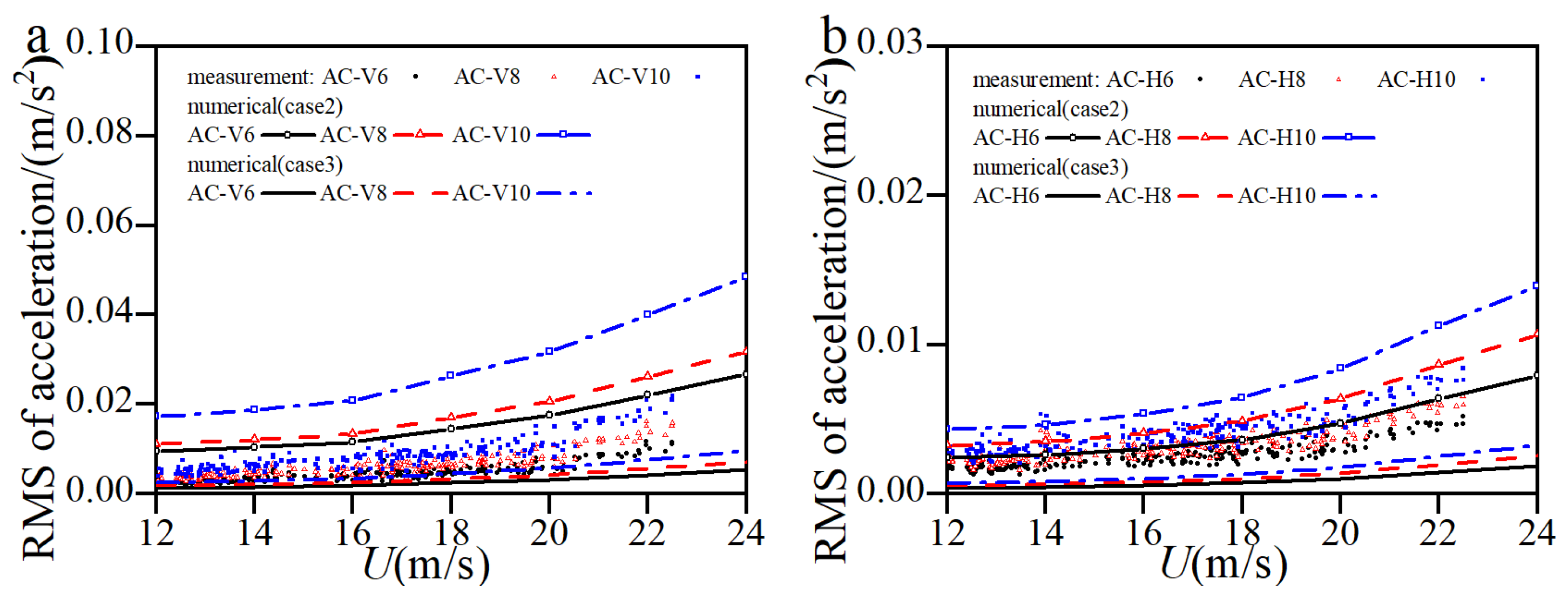 21] was applied to calculate the acceleration response at the cantilever end of the main girder under different wind speeds at the maximum single cantilever stage. According to wind tunnel test data, the first-order derivatives of the resistance, the lift force, and the moment coefficients (