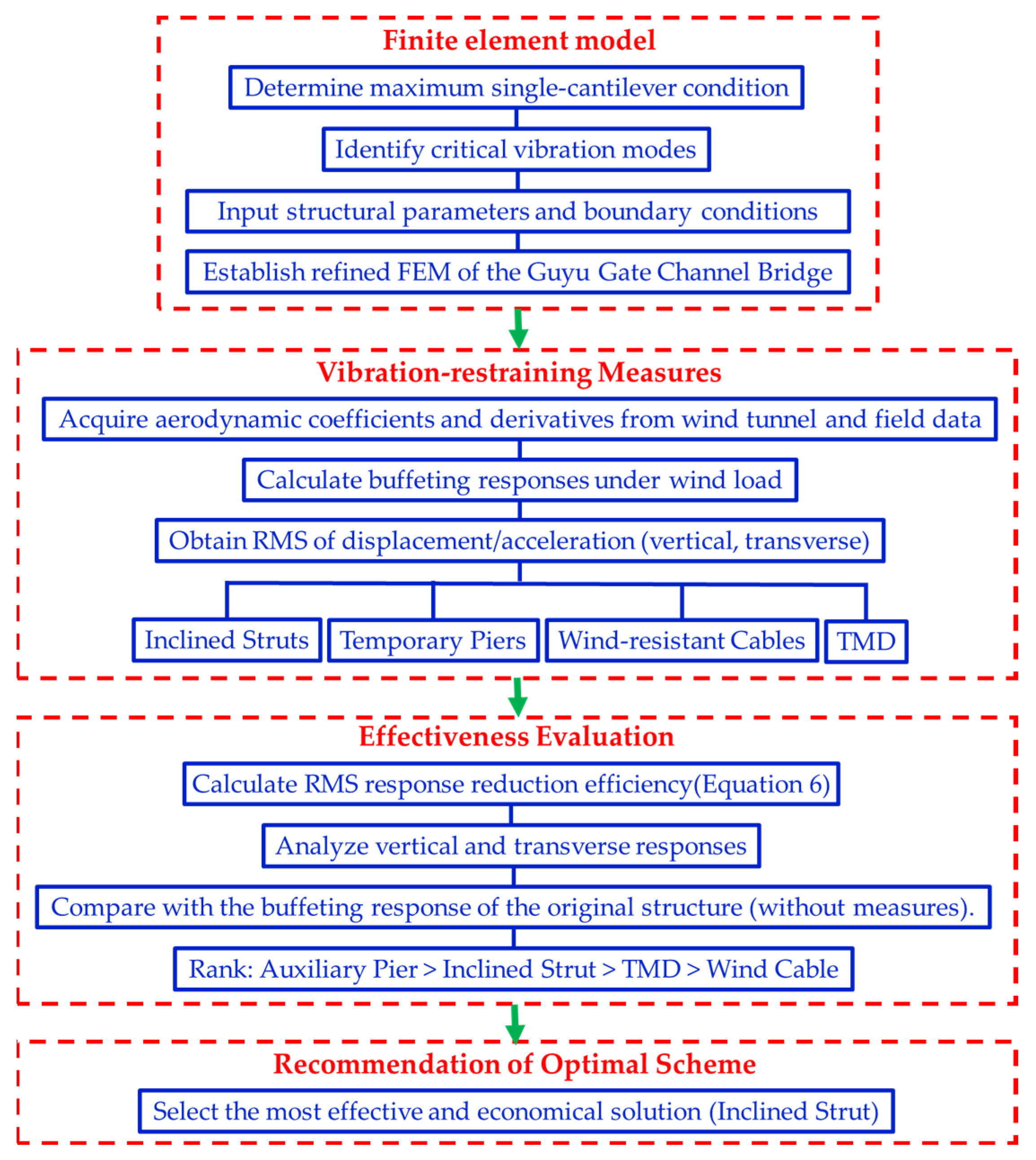 4]. Under this synchronization mechanism, once the system enters the so-called “lock-in” region, the vortex shedding frequency becomes governed by the structural vibration rather than by the wind speed, exhibiting the characteristics of self-excited vibration. For vortex-induced vibration effects, it can be effectively suppressed by optimizing the aerodynamic shape of the components’ cross-sections during the bridge’s design. However, for the buffeting induced by pulsating winds, as the bridge’s span increases, the stiffness decreases, especially in areas featuring strong winds such as the areas over the sea and deep-cut valleys. In this sense, the buffeting analysis and vibration control during construction become increasingly prominent.
