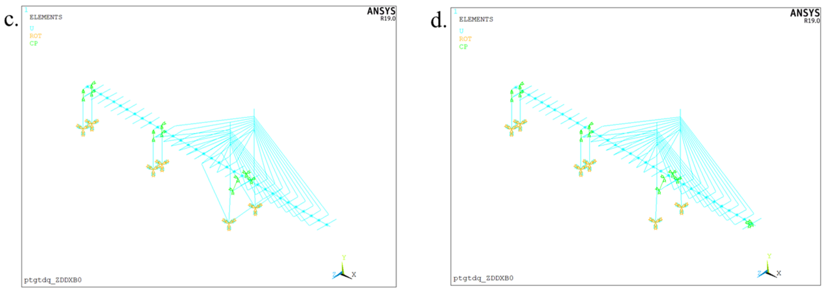 Finite element model diagram of the Guyu Gate Channel Bridge in the maximum single-cantilever state with different wind-resistant measures implemented: (a) Inclined strut; (b) Temporary pier; (c) Wind-resistant cable; (d) TMD.