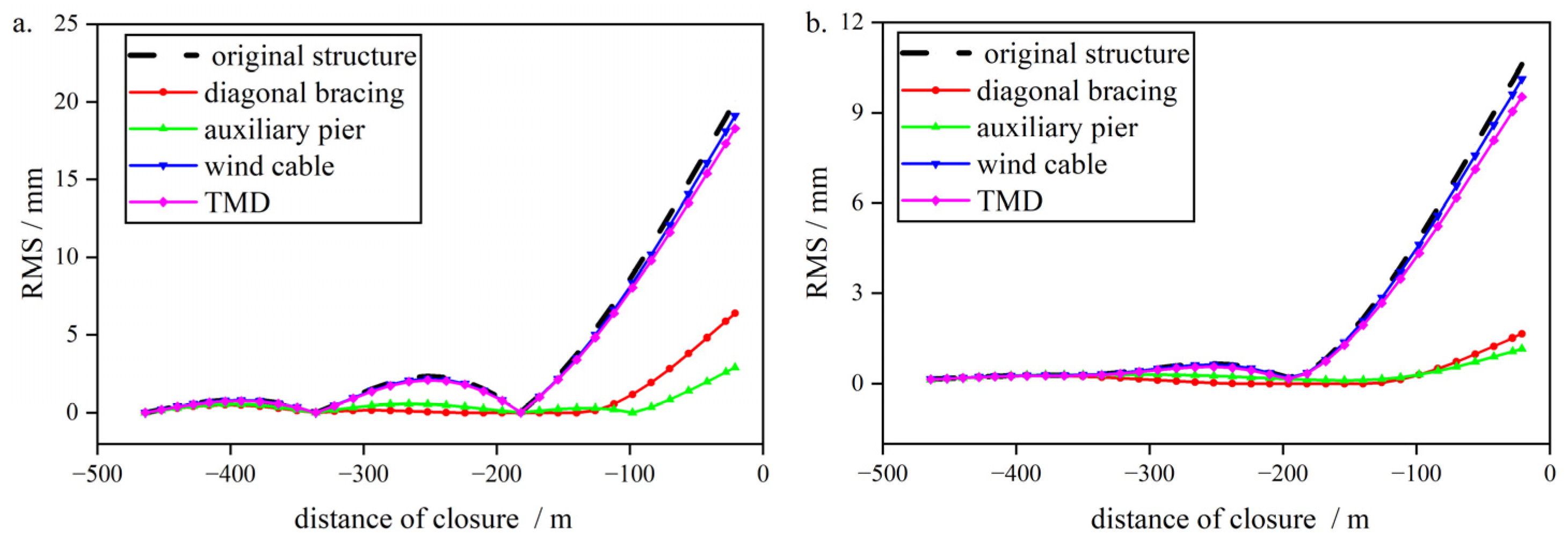 RMS of the Transverse Buffeting Response of the Main Girder: (a) Transverse; (b) Vertical.