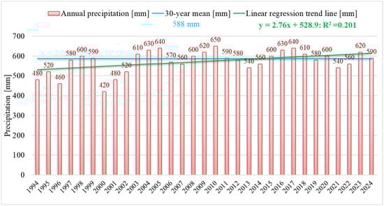 The 30-year mean annual precipitation equals 588 mm, and the linear regression trend line almost completely overlaps the mean line, underscoring the overall long-term stability of precipitation totals, although multi-year cycles of increase and decrease are evident, and a slight long-term upward tendency can be observed in the aggregated series (Figure 3).
