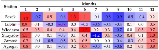 At the monthly scale, localized upward trends were observed in winter (January, December) at several stations and in the aggregated series. However, these did not translate into changes in annual totals. The heat map illustrates Sen’s slope values (mm/year) for individual months and monitoring stations, together with the aggregated series (mean across all stations) (Figure 4).