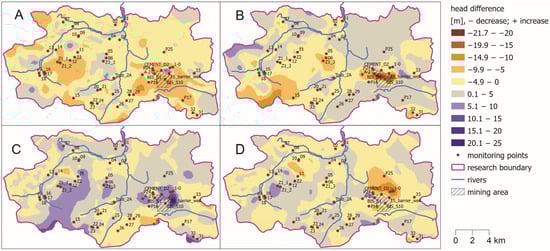 Groundwater head changes during the period of: (A)—2015–2009; (B)—2018–2015; (C)—2023–2018; (D)—2025–2023.