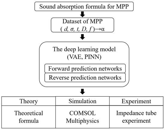 As illustrated in Figure 1, this study introduces a systematic deep learning methodology to accelerate MPP design. Initially, the dataset was generated using theoretical formulas derived from sound absorption theory of MPPs, and a nonlinear functional relationship between structural parameters and sound absorption coefficients was established. A PINN was then integrated into the VAE architecture to embed physical constraints into the loss function and mitigate solution space divergence inherent in conventional design methodologies through physical law regularization. Finally, the predictive and design capabilities of the model were validated through a comparative analysis between finite element simulations conducted in COMSOL Multiphysics and impedance tube experiments measuring sound absorption coefficients under standardized acoustic excitation conditions.