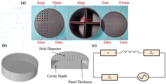 (a) Sample of the multi-parallel MPP. (b) Three-dimensional model of the MPP. (c) Equivalent circuit of the MPP. For the sample model, the pitches of the perforation arrays are 8 mm, 10 mm, 5 mm, and 5 mm, and the hole diameters are 3 mm, 2 mm, 1 mm, and 0.6 mm. The total diameter of the sample is 100 mm. A Bambu Lab X1E (Bambu Lab, Shenzhen, China) 3D printer was employed, and the sample material was PLA.