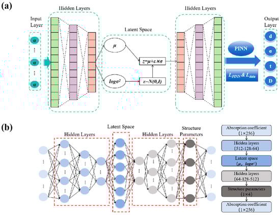 To overcome these challenges, more precise and efficient deep learning models are needed. With the widespread application of deep learning technologies across interdisciplinary domains, such as computer science, materials science, chemistry, and physics [28,29,30,31,32,33], physics-informed neural network (PINN)-based approaches have gained substantial attention across multiple disciplines [34,35,36,37,38,39,40]. By integrating physical governing laws with data-driven models, PINNs have advantages in addressing data loss issues, avoiding reliance on purely data-driven black-box models. Variational autoencoders (VAEs) have emerged as powerful tools for engineering optimization design [41,42,43,44], demonstrating significant benefits in probabilistic inference-enhanced dimensionality reduction, unsupervised data generation, and latent space representation. These models significantly reduce training costs and achieve target specifications even when data availability is limited. This study introduces a VAE architecture with a PINN. It combines the physics-embedded modeling principles of PINNs to ensure compliance with physical calculation conditions and the superior latent space representation of the VAE for efficient high-dimensional parameter compression, which can help the model achieve stable and unified output.