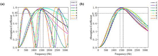 Seven parameter sets were selected through iterative optimization, as shown in Table 2(right). The sound absorption coefficient curve of the MPP basically meets the target requirements, and the difference in sound absorption coefficient curves has been significantly reduced, as shown in Figure 4b. Through this method, the problem of solution space divergence in inverse design can be effectively solved, and the robustness of the model and the stability of output results can be improved, making the results consistent.