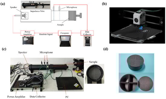 A band-limited white noise signal with a frequency range of 50–1600 Hz was generated using a signal generator (B&K 3160, Denmark) amplified via a power amplifier (B&K Type 2716C, Denmark) and then emitted through the loudspeaker into the impedance tube (B&K, Denmark). Two microphones (B&K, Denmark) were positioned to capture the amplitude and phase of the pressure distribution, from which absorption coefficients were derived. Using the above parameter combinations for modeling and printing, the sound absorption coefficients in the 50–1600 Hz frequency range were determined in an impedance tube using two microphones. All samples were produced using a 3D printer, as shown in Figure 5d.