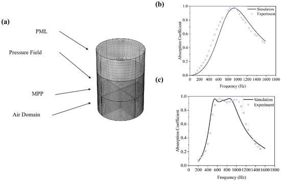 To verify the MPP’s design, a pressure acoustic frequency domain module was used for simulation and analysis using COMSOL Multiphysics 6.2 field software, and experiments were conducted using an impedance tube, as shown in Figure 5a. When establishing the model, we removed the solid part of the component, leaving only the air domain, and the material property of air is the default property in the software. The pressure acoustics module was used to establish a three-dimensional finite element model to study the acoustic absorption mechanism of the MPP, and the model is shown in Figure 6a. In the finite element model, the structural interfaces are covered by boundary layers to include the visco-thermal losses, and the computation domain terminates with perfectly matched layers (PMLs) to avoid boundary reflections. Free tetrahedral meshing was performed on the overall model to capture the reflection and propagation characteristics of sound waves on the surface, and the grid size was 1/6 of the wavelength. The upper part of the model was set with a pressure field, and the amplitude was 1 Pa. A frequency range of 50–1600 Hz was selected for finite element simulation, and the reflection and absorption coefficients () were calculated based on the scattered sound pressure and the incident sound pressure.