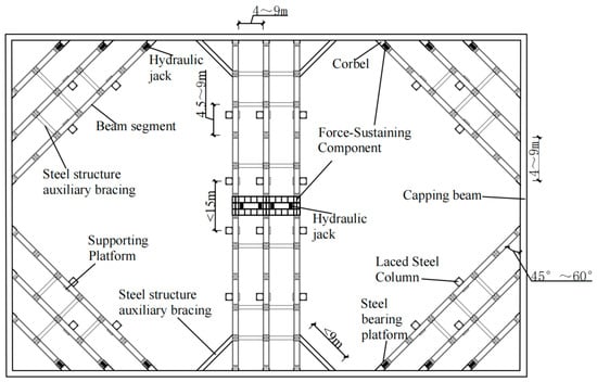 As mentioned above, in order to facilitate the study of the influence of beam sleeve and holes on the stress of beam segments, the stress of beam segments in this paper is simplified as axial compression and the bending moment and shear force caused by self-weight are ignored. Because only the length and cross-sectional dimensions of the single beam segment were considered, it is concluded that the beam segment is in a short column compression state. This stress state is significantly different from the stress state when the beam segments are spliced into the main bracing for foundation pit engineering. In practical engineering, the main bracing (see Figure 1) is generally subjected to eccentric compression, and the bending moment and shear force caused by its own weight should be considered. The slenderness ratio should also be calculated based on the length between the two lattice columns and the cross-sectional size of the main bracing to determine whether the stability of the compression bar should be considered. Only by considering these forces comprehensively can the reinforcement and cross-sectional dimensions of the main bracing (beam segment) be designed.